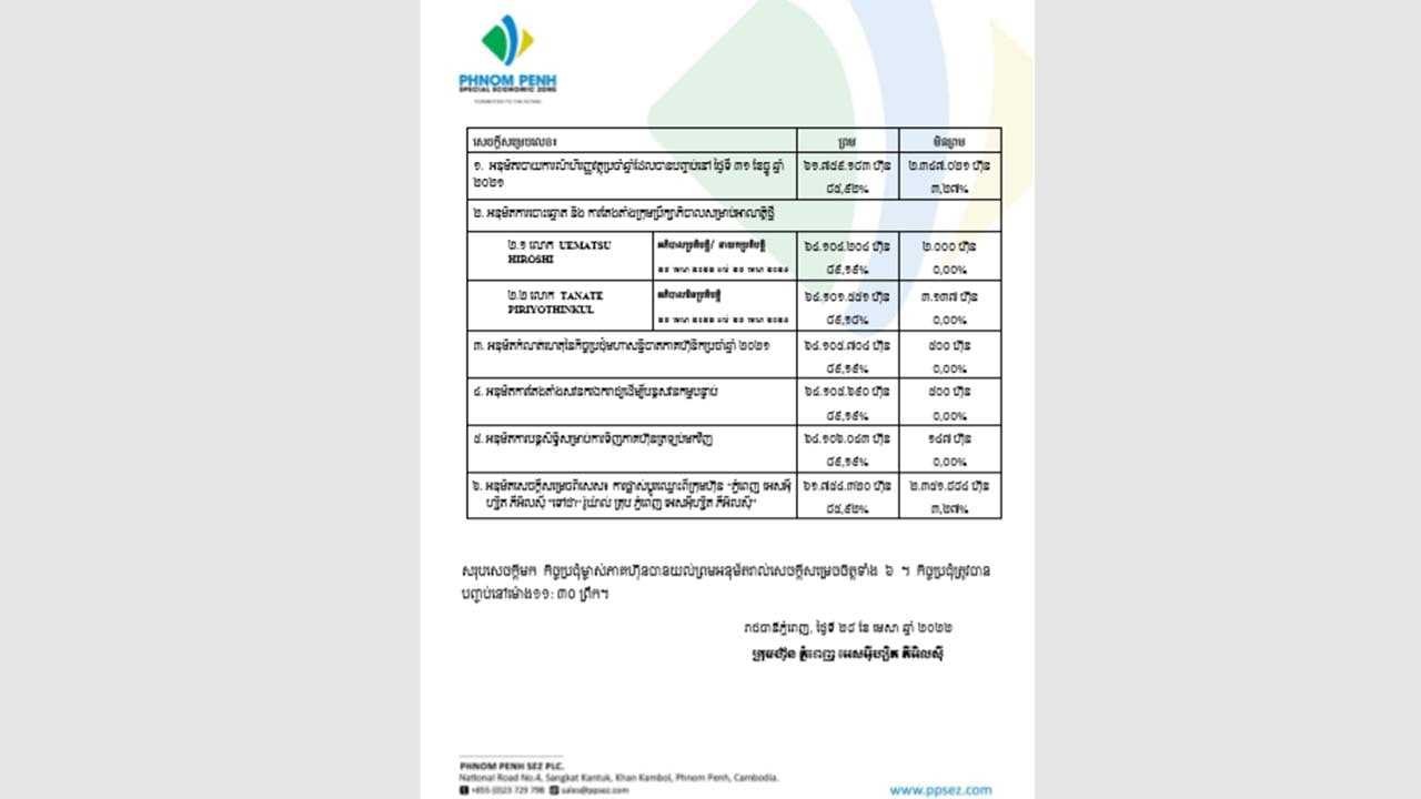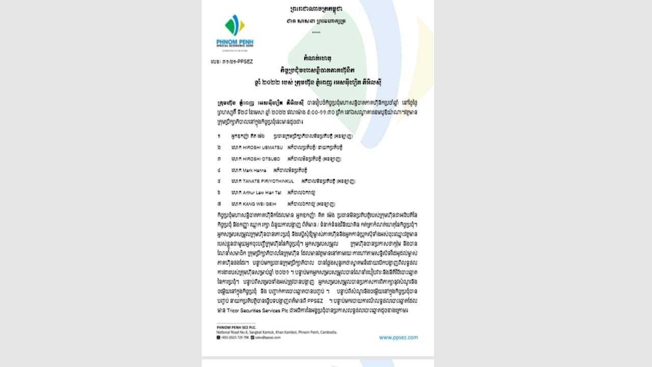 ថ្លែងតាមវីដេអូអនឡាញ អ្នកឧកញ៉ា គិត ម៉េងប្រធានក្រុមប្រឹក្សាភិបាលនៃក្រុមហ៊ុនភ្នំពេញ អេសអ៊ីហ្សិត ភីអិលស៊ី បានបង្ហាញសេចក្តីសោមនស្សរីករាយក្នុងការស្វាគមន៍នៃការរៀបចំកិច្ចប្រជុំមហាសន្និបាតភាគហ៊ុនិកប្រចាំឆ្នាំលើកទី ៦របស់ក្រុមហ៊ុន សម្រាប់ឆ្នាំហិរញ្ញវត្ថុដែលបានបញ្ចប់នៅថ្ងៃទី ៣១ ខែធ្នូ ឆ្នាំ ២០២១ ចាប់តាំងពីការចុះបញ្ជីរបស់ក្រុមហ៊ុនក្នុងឆ្នាំ ២០២១។ ឆ្នាំនេះក្រុមហ៊ុន កំពុងរៀបចំមហាសន្និបាតភាគហ៊ុនិកប្រចាំរបស់ខ្លួន បន្ទាប់ពីផ្អាករយៈពេល ២ ឆ្នាំ ដែលត្រូវបានរំខានដោយជំងឺរាតត្បាតកូវីដ១៩។