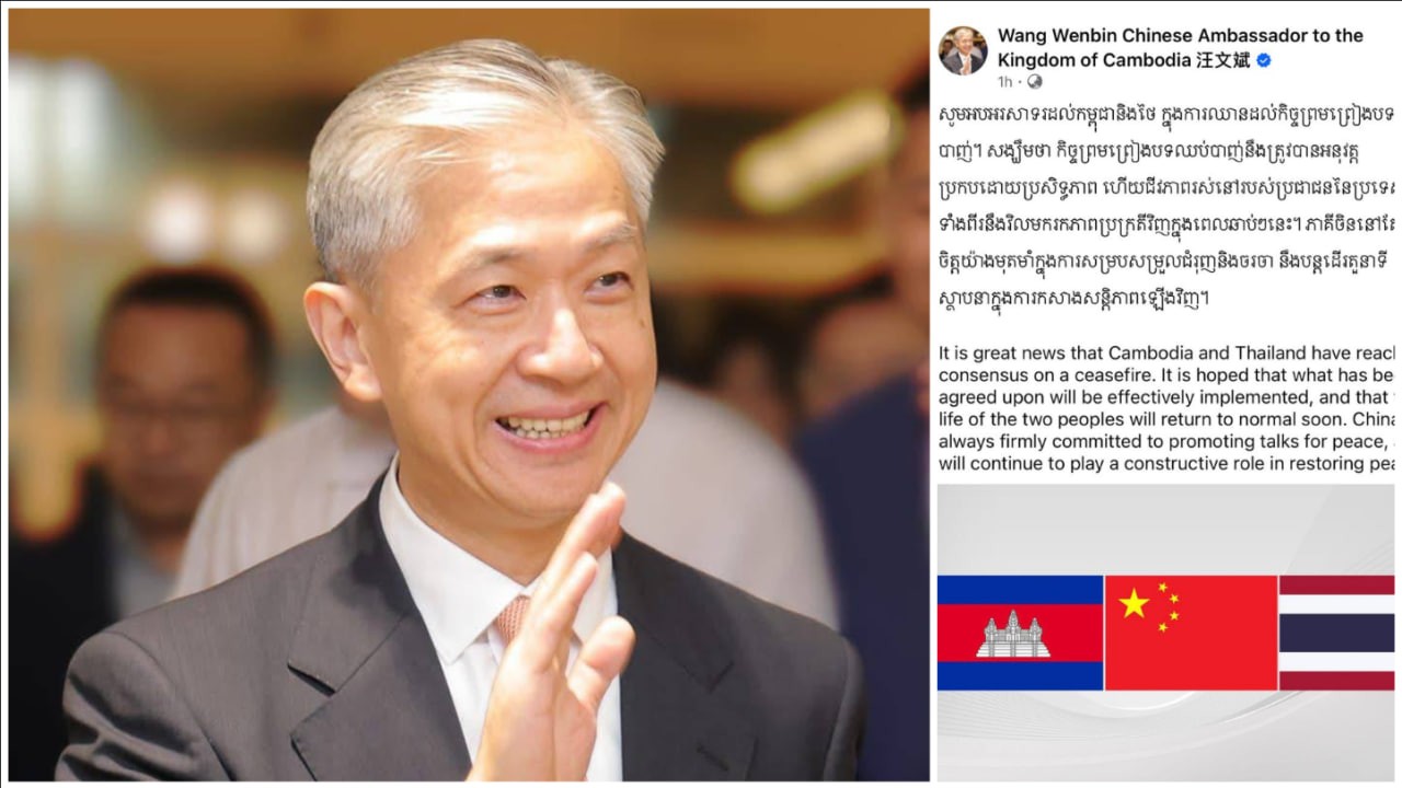 ឯកអគ្គរដ្ឋទូតចិនប្រចាំកម្ពុជា ឯកឧត្តម Wang Wenbin អបអរសាទរដល់កម្ពុជា-ថៃ ដែលឈានដល់កិច្ចព្រមព្រៀងបទឈប់បាញ់