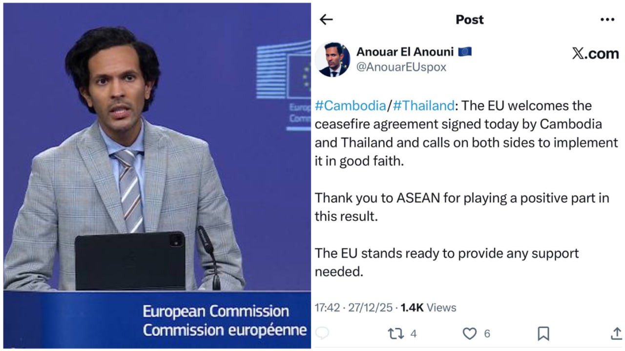 អ្នកនាំពាក្យសហភាពអឺរ៉ុប អបអរសាទរចំពោះកិច្ចព្រមព្រៀងបទឈប់បាញ់រវាងកម្ពុជា-ថៃ និងគូសបញ្ជាក់ពីការត្រៀមខ្លួនរួចជាស្រេចក្នុងការផ្តល់ការគាំទ្រណាមួយដែលចាំបាច់