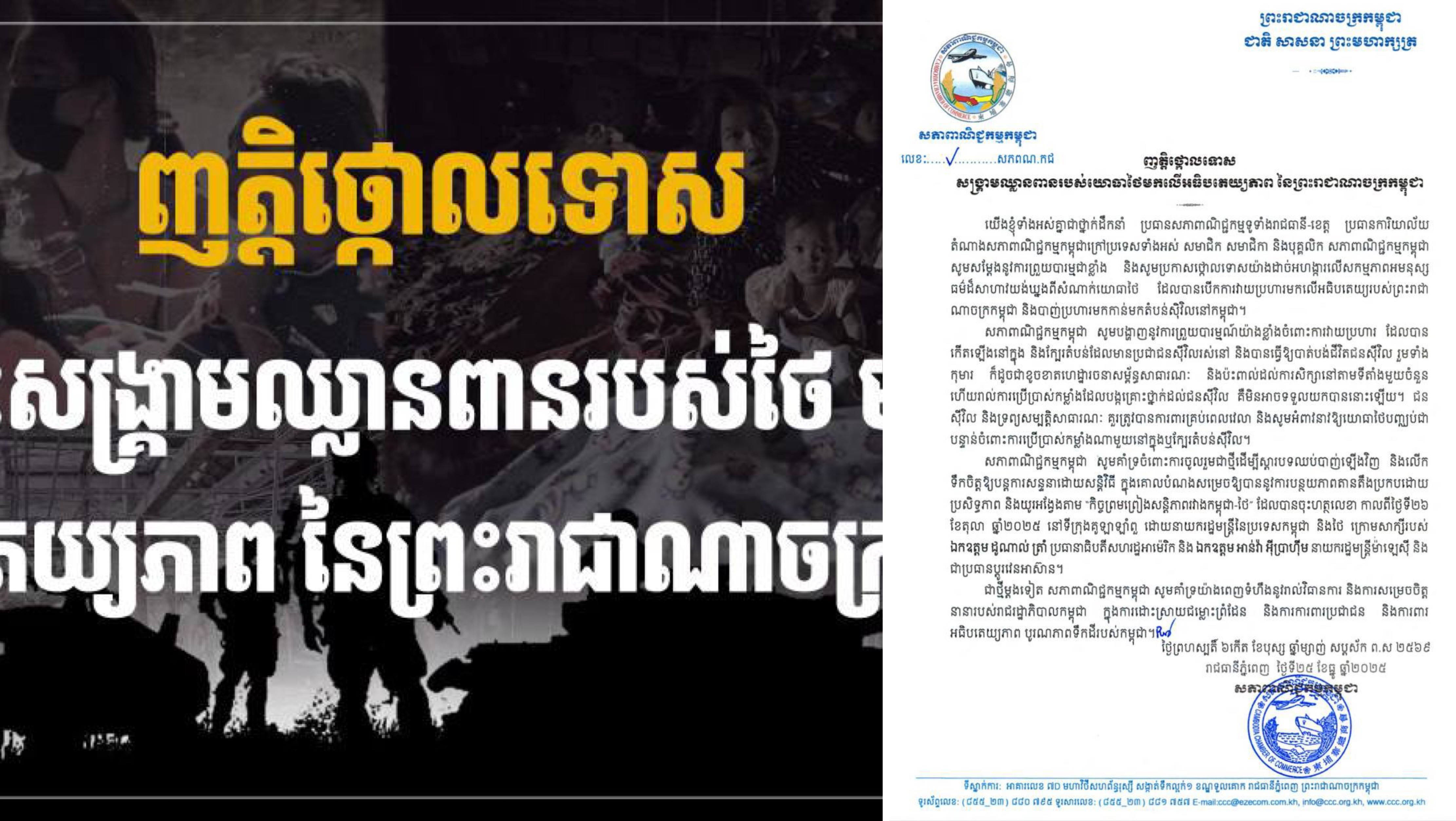 សភាពាណិជ្ជកម្មកម្ពុជា ចេញញត្តិថ្កោលទោសសង្គ្រាមឈ្លានពានរបស់យោធាថៃ មកលើអធិបតេយ្យភាព នៃព្រះរាជាណាចក្រកម្ពុជា