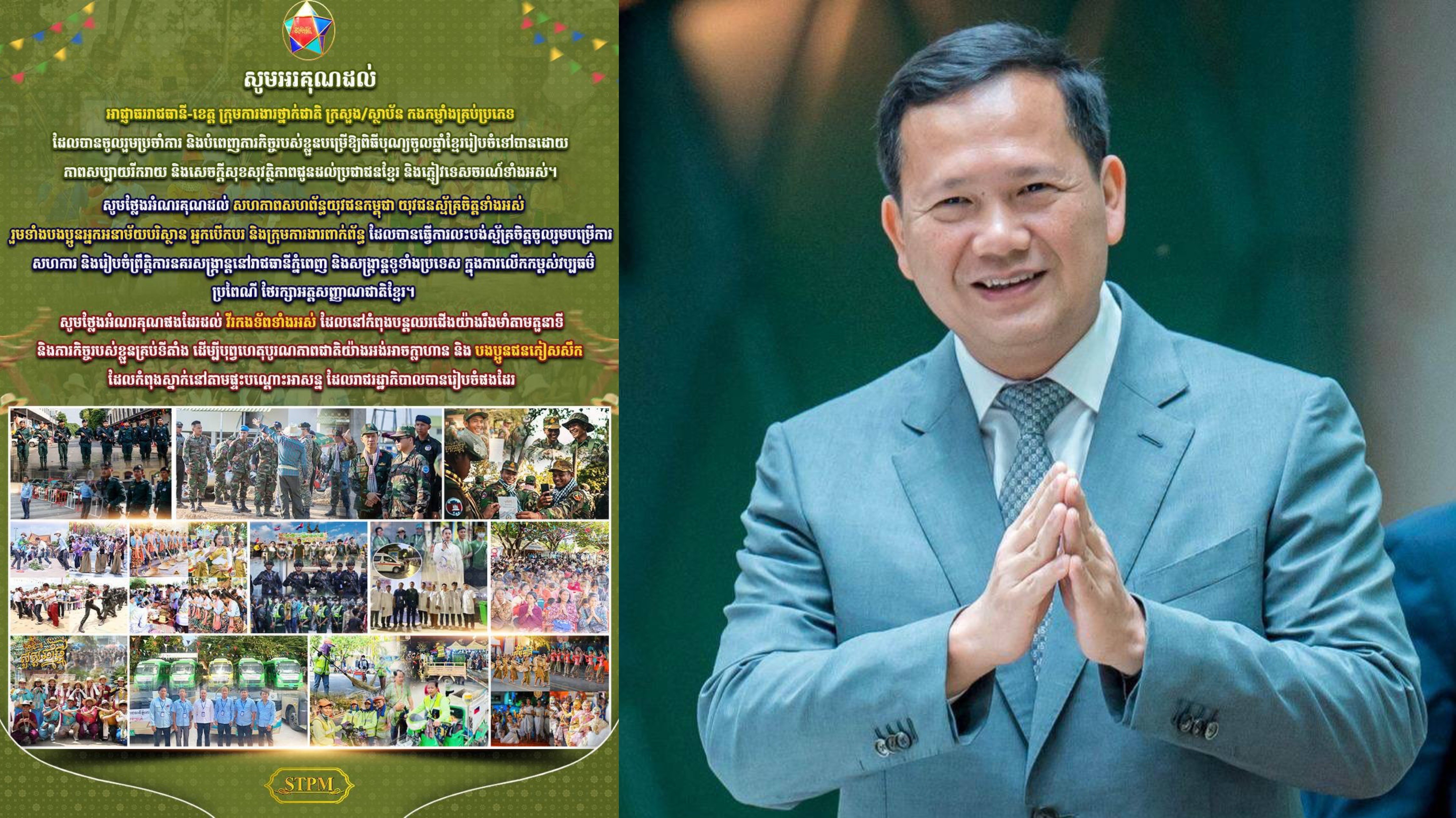 សម្តេចបវរធិបតី ថ្លែងអំណរគុណដល់វីរកងទ័ព ទាំងអស់ ដែលនៅកំពុងបន្តឈរជើងយ៉ាងរឹងមាំតាមតួនាទី និងភារកិច្ចរបស់ខ្លួនគ្រប់ទីតាំង ដើម្បីបុព្វហេតុបូរណភាពជាតិយ៉ាងអង់អាចក្លាហាន