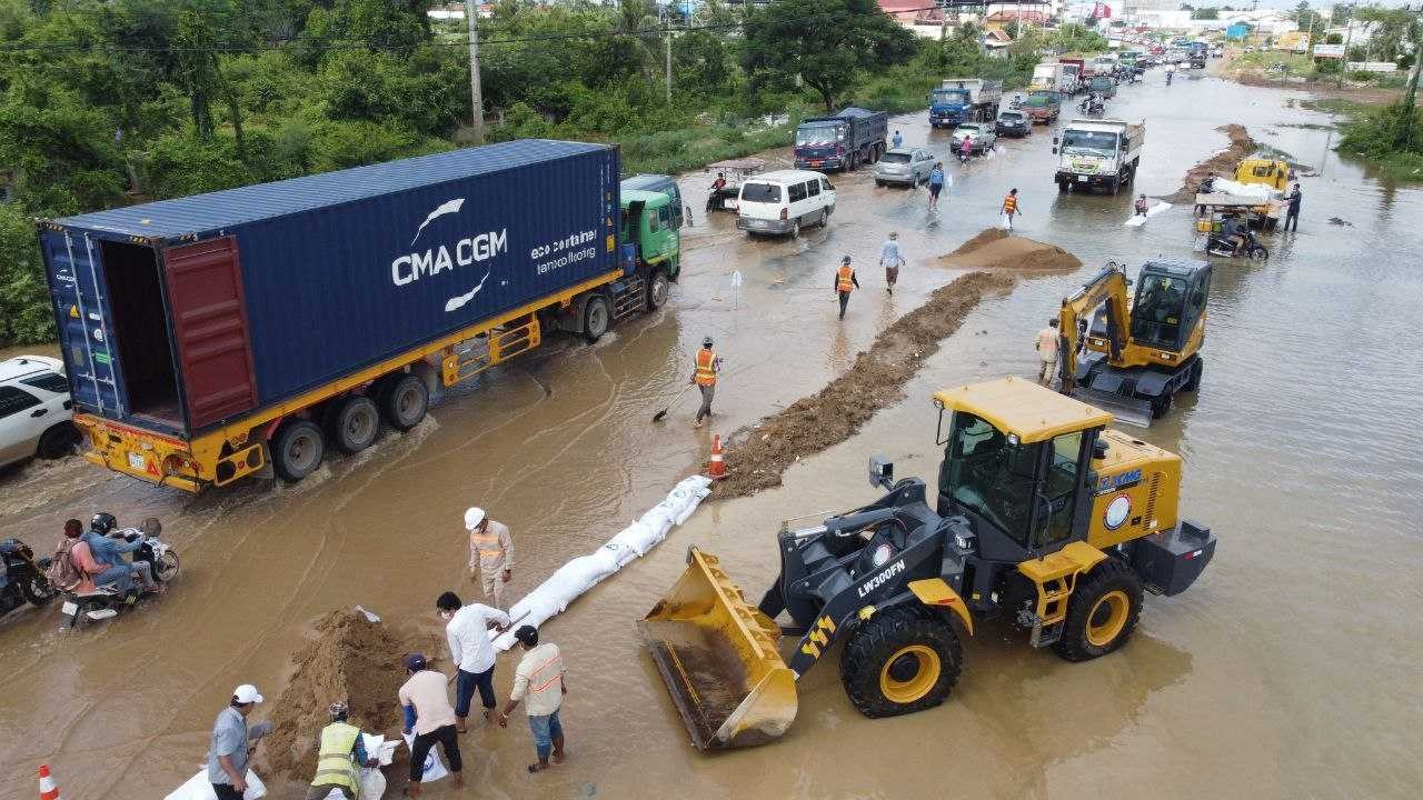 ក្រោយជំនន់ទឹកភ្លៀងលិចកំណាត់ផ្លូវជាតិលេខ៤ មន្ទីរជំនាញខេត្តកំពង់ស្ពឺ ដាក់គ្រឿងចក្រទៅជួសជុលបន្ទាន់