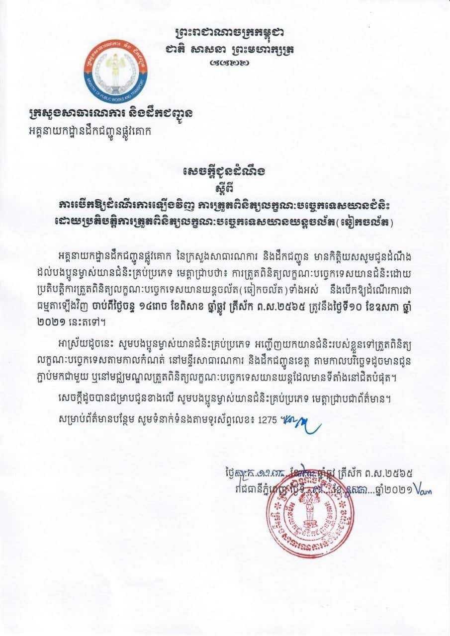 ប្រជាពលរដ្ឋអាចយកយានយន្ត មកធ្វើការត្រួតពិនិត្យលក្ខណៈបច្ចេកទេសនៅទីតាំងពោធិ៍សែនជ័យ-អូដឹម ចាប់ពីថ្ងៃទី២១ ខែមករា ឆ្នាំ២០២២ នេះតទៅ នៅរៀងរាល់ម៉ោងធ្វើការ ដែលមានទីតាំងនៅលើផ្លូវជាតិលេខ៤ ភូមិអូដឹម សង្កាត់ចោមចៅ ខណ្ឌពោធិ៍សែនជ័យ រាជធានីភ្នំពេញ ខាងលិចស្តុបជម្ពូរវ័ន ចម្ងាយ ២០០ម៉ែត ជាប់នឹងបុរីអូដឹម២៕