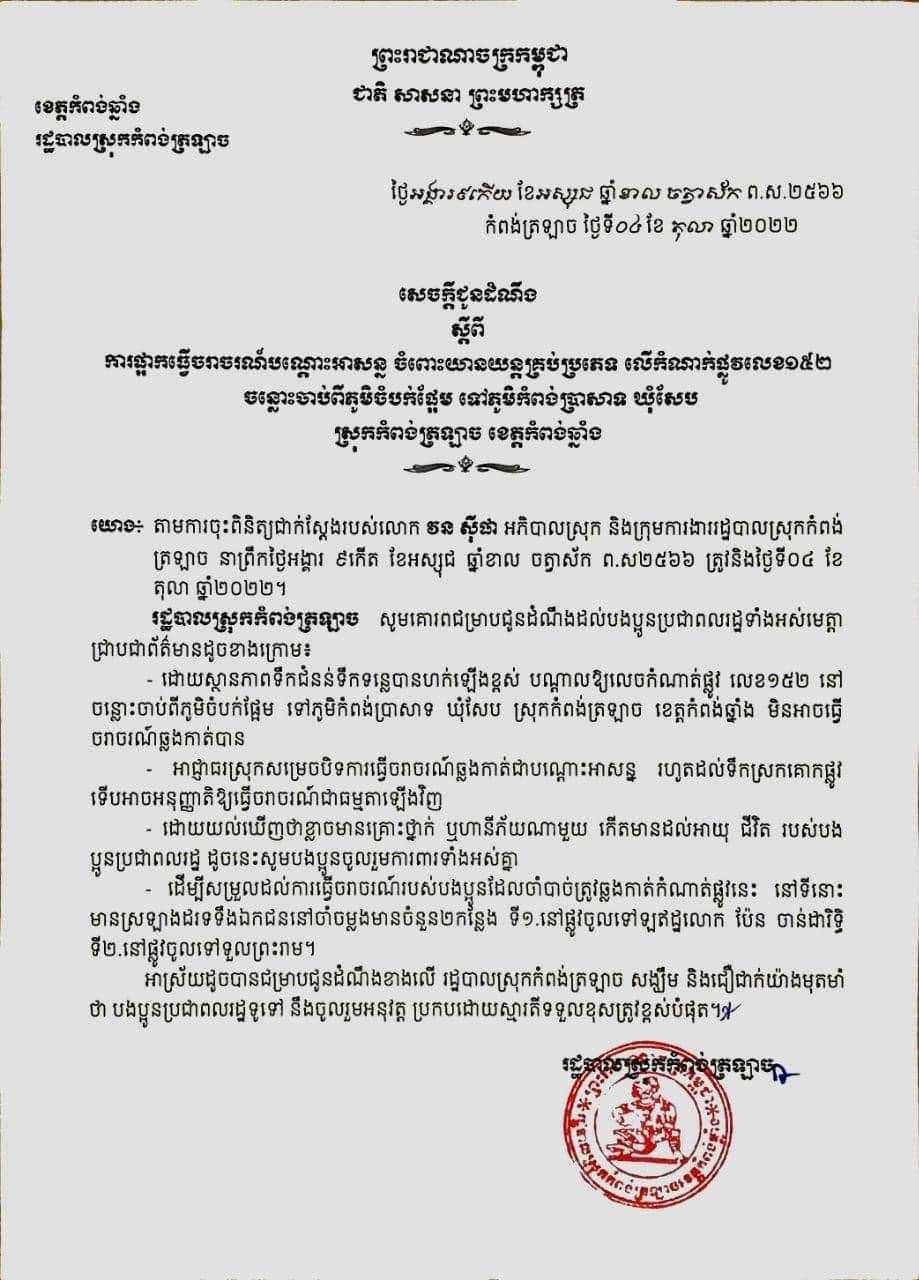 អាជ្ញាធរស្រុកកំពង់ត្រឡាច សម្រេចផ្អាកចរាចរណ៍បណ្តោះអាសន្ន លើកំណាក់ផ្លូវលេខ ១៥២ ចន្លោះចាប់ពីភូមិចំបក់ផ្អែម ទៅភូមិកំពង់ប្រាសាទ