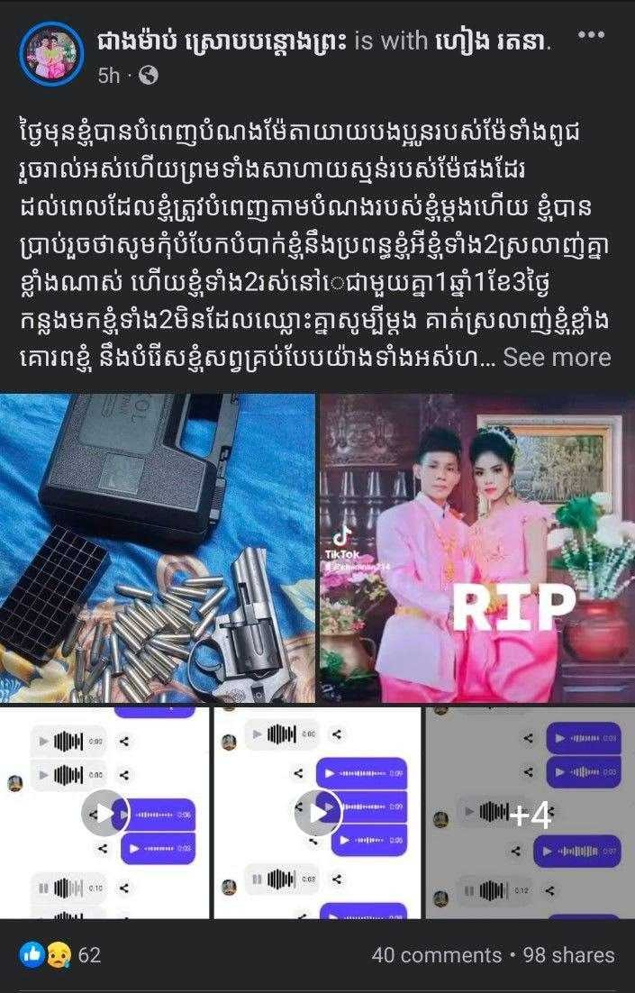 កំពង់ធំ៖ បុរសអាយុ២៩ឆ្នាំម្នាក់ បានចូលទៅក្នុងផ្ទះរបស់គ្រួសារប្រពន្ធ ស្ថិតនៅក្នុងឃុំអណ្តូងពោធិ៍ ស្រុកតាំងគោក ខេត្តកំពង់ធំ ដោយមានកាំភ្លើងខ្លីយកតាមខ្លួន កាលពីវេលាម៉ោង ៨:៣០នាទី ថ្ងៃទី២៧ ខែមីនា ឆ្នាំ២០២៣។ ពេលដែលជនសង្ស័យចូលដល់ក្នុងផ្ទះ បានយកកាំភ្លើងបាញ់សម្លាប់ស្ត្រីអាយុ ៥៧ឆ្នាំ ដែលត្រូវជាជីដូនរបស់ប្រពន្ធ រួចបាញ់សម្លាប់ក្មេងប្រុសអាយុ ១០ឆ្នាំ ដែលត្រូវជាប្អូនប្រុសបង្កើតរបស់ប្រពន្ធ។ បន្ទាប់មកជនសង្ស័យបានបាញ់ទៅលើប្រពន្ធរបស់ខ្លួនដែលមានអាយុ ១៨ឆ្នាំ បង្កឱ្យរងរបួសធ្ងន់ មុននឹងរត់គេចខ្លួន។