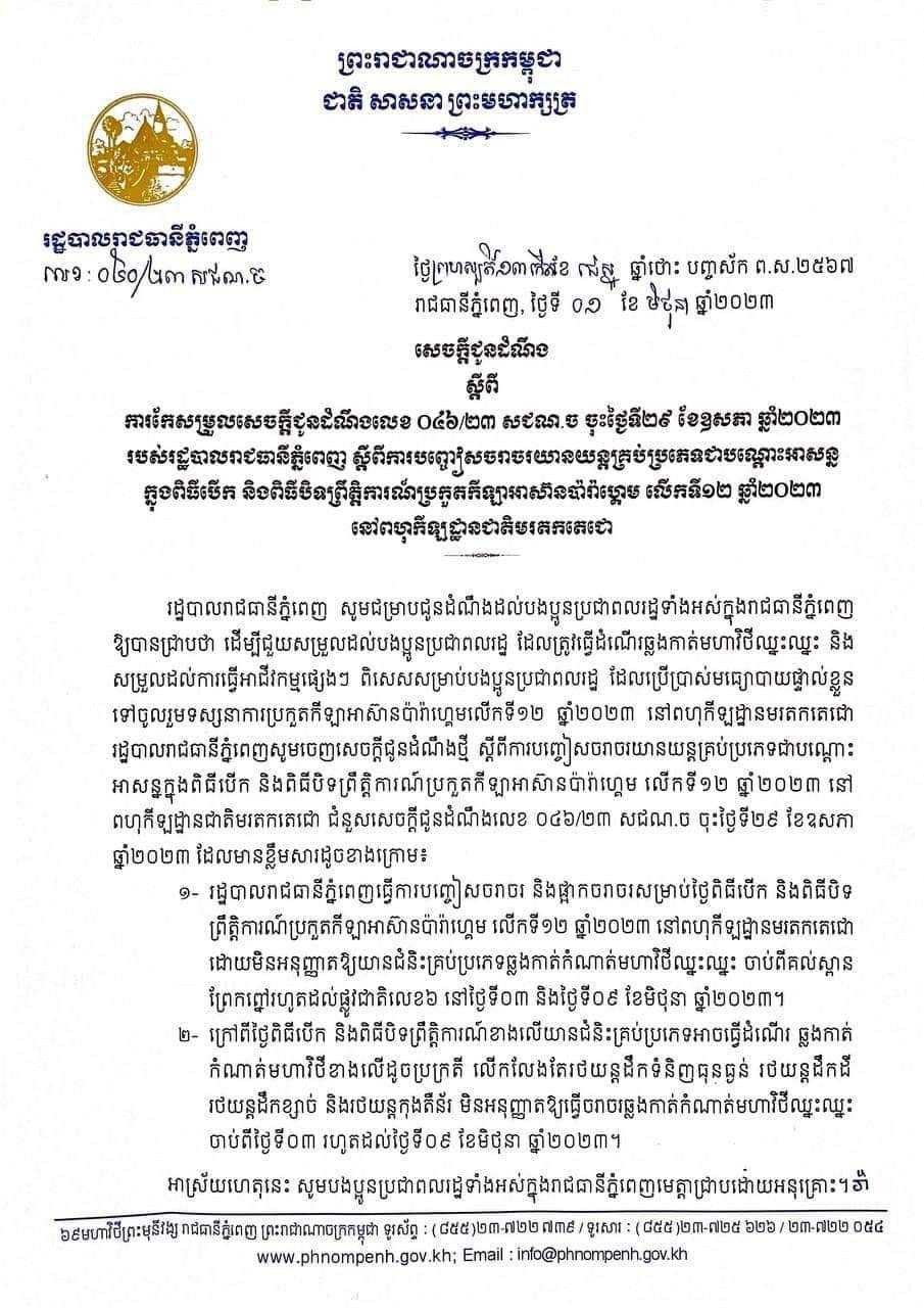 ក្នុងសេចក្តីជូនដំណឹង នៅរសៀលថ្ងៃទី១ ខែមិថុនា ឆ្នាំ២០២៣ បានឱ្យដឹងថា ដើម្បីជួយសម្រួលដល់ប្រជាពលរដ្ឋដែលត្រូវធ្វើដំណើរឆ្លងកាត់មហាវិថី ឈ្នះ ឈ្នះ និងសម្រួលដល់ការធ្វើអាជីវកម្មផ្សេងៗ ពិសេសសម្រាប់ប្រជាពលរដ្ឋ ដែលប្រើប្រាស់មធ្យោបាយផ្ទាល់ខ្លួន ទៅចូលរួមទស្សនាការប្រកួតកីឡាអាស៊ានប៉ារ៉ាហ្គេមលើកទី១២ ឆ្នាំ២០២៣ នៅពហុកីឡដ្ឋានមរតកតេជោ រដ្ឋបាលរាជធានីភ្នំពេញ នឹងបញ្ចៀសចរាចរយានយន្តគ្រប់ប្រភេទជាបណ្តោះអាសន្នក្នុងពិធីបើក និងពិធីបិទព្រឹត្តិការណ៍ប្រកួតកីឡាអាស៊ានប៉ារ៉ាហ្គេម លើកទី១២ ឆ្នាំ២០២៣ នៅពហុកីឡដ្ឋានជាតិមរតកតេជោ ជំនួសសេចក្តីជូនដំណឹងលេខ ០៤៦/២៣ សជណច ចុះថ្ងៃទី២៩ ខែឧសភា ឆ្នាំ២០២៣ ដែលមានខ្លឹមសារដូចខាងក្រោម៖