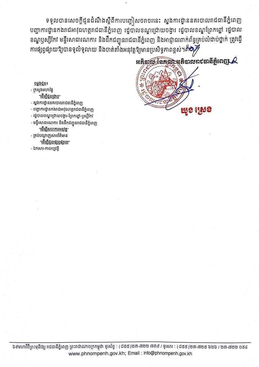 ភ្នំពេញ៖ រដ្ឋបាលរាជធានីភ្នំពេញ ចេញសេចក្តីជូនដំណឹងស្តីពី ការកែសម្រួលសេចក្តីជូនដំណឹងលេខ ០៤៦/២៣ សជណ.ច ចុះថ្ងៃទី២៩ ខែឧសភា ឆ្នាំ២០២៣ របស់រដ្ឋបាលរាជធានីភ្នំពេញស្ដីពី ការបញ្ចៀសចរាចរយានយន្តគ្រប់ប្រភេទជាបណ្ដោះអាសន្ន ក្នុងពិធីបើក និងពិធីបិទព្រឹត្តិការណ៍ប្រកួតកីឡាអាស៊ានប៉ារ៉ាហ្គេម លើកទី១២ ឆ្នាំ២០២៣ នៅពហុកីឡដា្ឋនជាតិបរតកតេជោ។