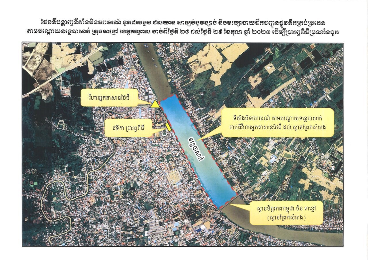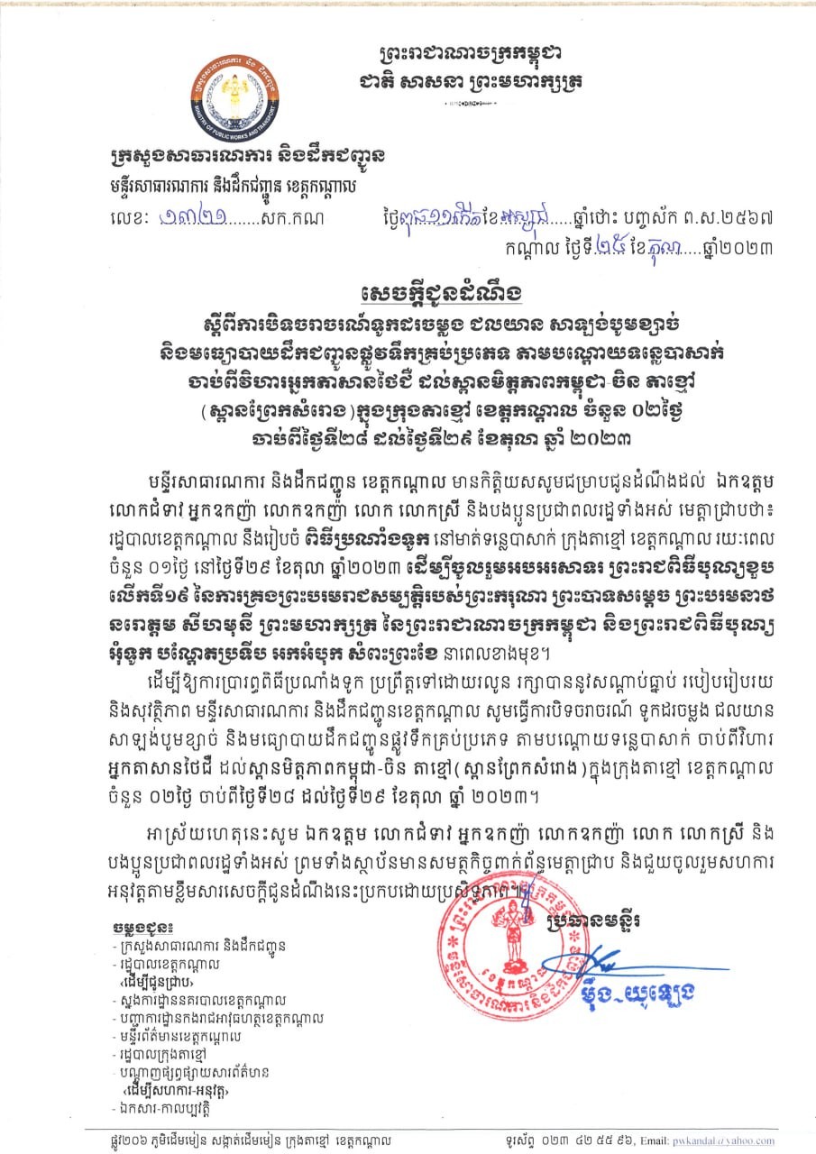 កណ្តាល៖ ដើម្បីចូលរួមអបអរសាទរ ព្រះរាជពិធីបុណ្យខួបលើកទី១៩ នៃការគ្រងព្រះបរមរាជសម្បត្តិរបស់ព្រះករុណា ព្រះបាទសម្តេច ព្រះបរមនាថ នរោត្ដម សីហមុនី ព្រះមហាក្សត្រ នៃព្រះរាជាណាចក្រកម្ពុជា និងព្រះរាជពិធីបុណ្យ អុំទូក បណ្តែតប្រទីប អកអំបុក សំពះព្រះខែ នាពេលខាងមុខ ក្រសួងសាធារណៈការ ប្រកាសបិទចរាចរណ៍ទូកដរចម្លង ជលយាន សាឡង់បូមខ្សាច់ និងមធ្យោបាយដឹកជញ្ជូនផ្លូវទឹកគ្រប់ប្រភេទ តាមបណ្ដោយទន្លេបាសាក់ ចាប់ពីវិហារអ្នកតាសានថៃជឺ ដល់ស្ពានមិត្តភាពកម្ពុជា-ចិន តាខ្មៅ (ស្ពានព្រែកសំរោង) ក្នុងក្រុងតាខ្មៅ ខេត្តកណ្តាល ចំនួន២ថ្ងៃ ចាប់ពីថ្ងៃទី២៨ ដល់ថ្ងៃទី២៩ ខែតុលា ឆ្នាំ២០២៣។