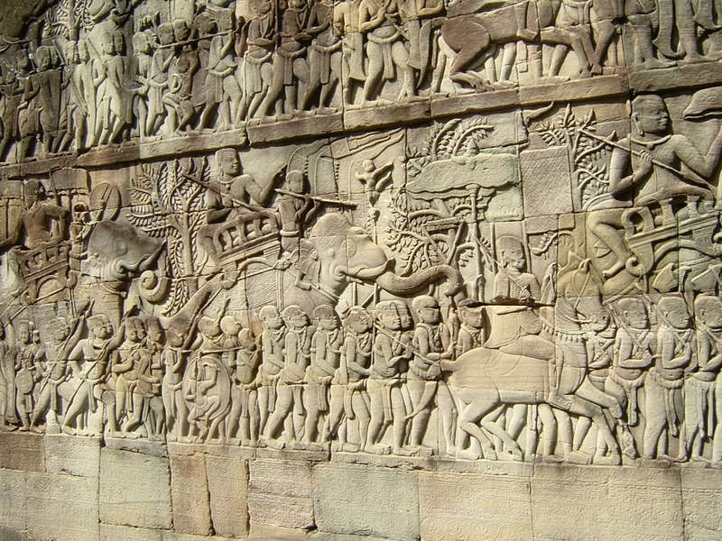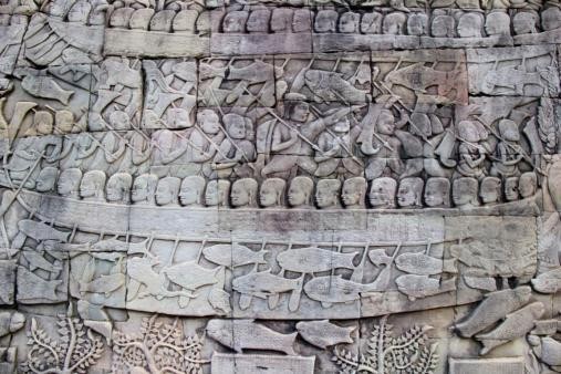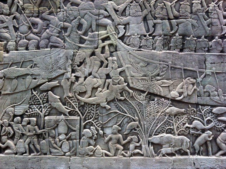 យោងតាមសៀវភៅជ័យវរ្ម័នទី៧ មាននៅក្នុងវិទ្យាស្ថានពុទ្ធសាសនបណ្ឌិត្យ ពីដើមមានចែងថា នៅក្នុងសម័យអង្គរនា គ.ស. សតវត្សរ៍ទី១២ ប្រទេសកម្ពុជា មានសេចក្តីសុខក្សេមក្សាន្តរុងរឿងណាស់ ដោយព្រះបាទជ័យវរ្ម័នទី៧ ស្តេចយាងធ្វើសង្គ្រាមជើងទឹក ដើម្បីបង្ក្រាបពួកចាម ដោយកងទ័ពទូកជាចម្បាំងរំដោះ ក្រុងកម្ពុជាឱ្យរួចផុត ស្រឡះពីខ្មាំងសត្រូវ (គ.ស. ១១៧៧-១១៨១) រឿងចម្បាំងគ្រានោះ មានឆ្លាក់នៅលើជញ្ជាំងប្រាសាទបាយ័ន និងបន្ទាយឆ្មារ។ ក្នុងចម្លាក់នោះ មានកងទ័ពទូកយ៉ាងច្រើនមហិមា ដែលមានព្រះឆាយាល័ក្ខណ៍ ព្រះបាទ ជ័យវរ្ម័នទី៧ ប្រថាប់ឈរលើទីតាំងនាវាចម្បាំងដោយទ្រង់ធ្នូ និងដំបងយ៉ាងស្វាហាប់ ក្នុងចំណោមកងទ័ព ទូកទាំងឡាយ។