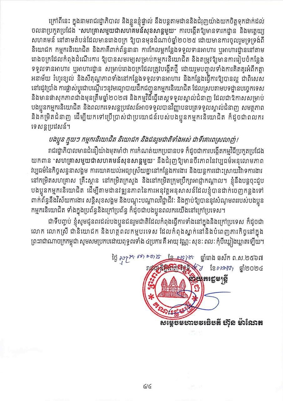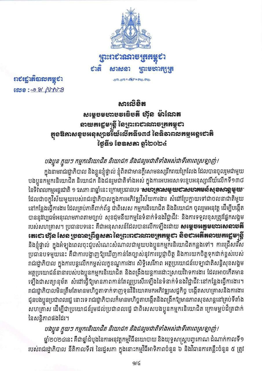 ភ្នំពេញ៖ សម្តេចមហាបវរធិបតី ហ៊ុន ម៉ាណែត នាយករដ្ឋមន្ត្រី នៃព្រះរាជាណាចក្រកម្ពុជា ក្នុងសារលិខិតឱកាសខួបអនុស្សាវរីយ៍លើកទី១៣៨ នៃទិវាពលកម្មអន្តរជាតិ ថ្ងៃទី១ ខែឧសភា ឆ្នាំ២០២៤ បានថ្លែងថាឆ្នាំ២០២៤នេះ គឺជាឆ្នាំដំបូងនៃការអនុវត្តកម្មវិធីនយោបាយ និងយុទ្ធសាស្ត្របញ្ចកោណ ដំណាក់កាលទី១ របស់រាជរដ្ឋាភិបាល នីតិកាលទី៧ នៃរដ្ឋសភា ក្នុងនោះកម្មវិធីអាទិភាពចំនួន ៦ និងវិធានការគន្លឹះចំនួន ៥ ត្រូវបានដាក់ចេញដោយរាជរដ្ឋាភិបាល សំដៅធានាឱ្យបាននូវប្រសិទ្ធភាពនៃការអនុវត្តកម្មវិធីនយោបាយ និងការកែ ទម្រង់ស៊ីជម្រៅ ក្នុងគោលបំណងសម្រួលការធ្វើធុរកិច្ច អាជីវកម្ម ពាណិជ្ជកម្ម និងការវិនិយោគ ដើម្បីជំរុញ ការអភិវឌ្ឍសេដ្ឋកិច្ចលើគ្រប់វិស័យ និងលើកកម្ពស់ជីវភាពរស់នៅរបស់ប្រជាពលរដ្ឋឱ្យកាន់តែមានចំណូលខ្ពស់ ការងារកាន់តែសមរម្យនិងសម្បូរបែប ដើម្បីឈានទៅសម្រេចបានចក្ខុវិស័យកម្ពុជាជាប្រទេសមានចំណូលខ្ពស់ នៅឆ្នាំ២០៥០។