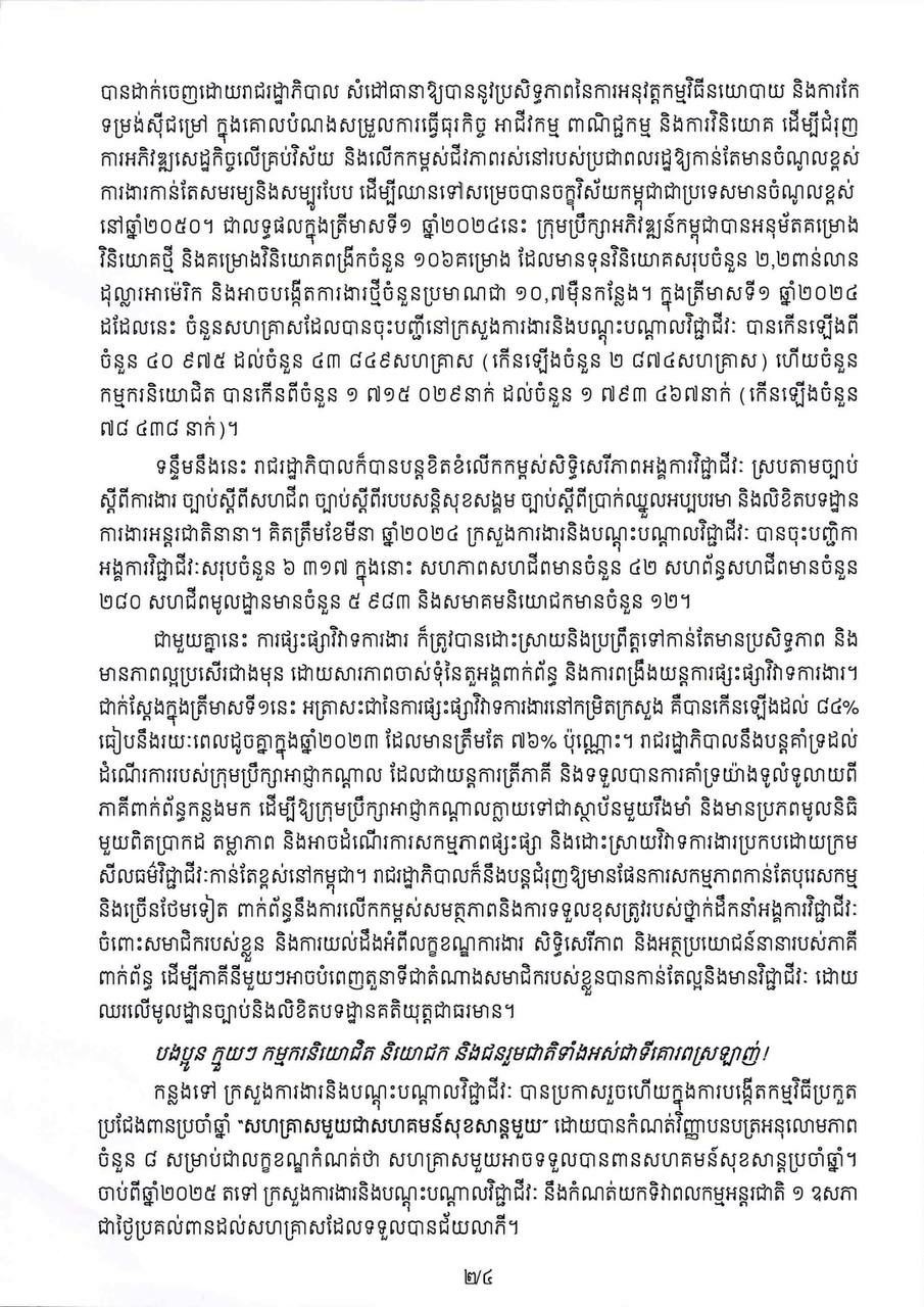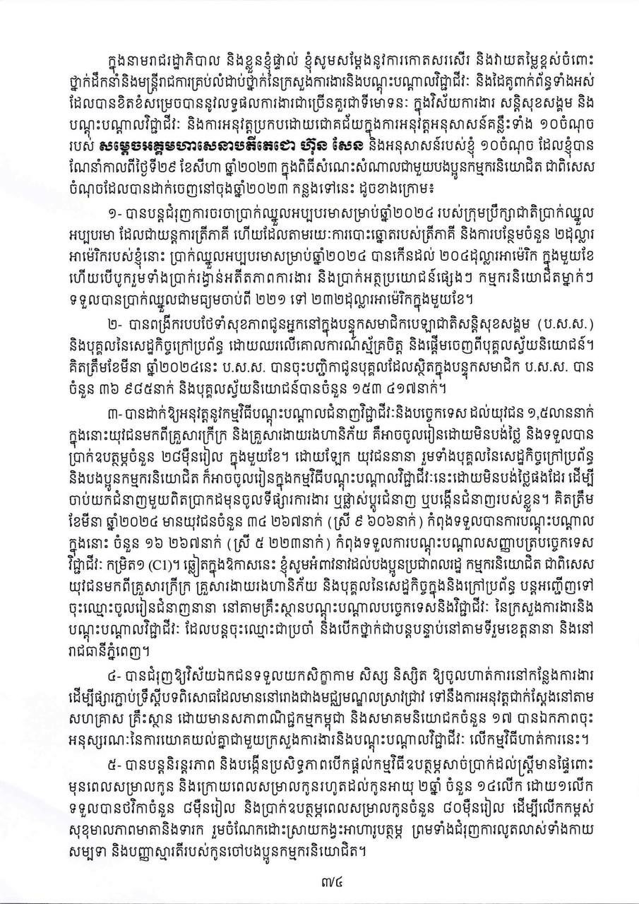 សម្តេចមហាបវរធិបតី បានបញ្ជាក់ថា ជាលទ្ធផលក្នុងត្រីមាសទី១ ឆ្នាំ២០២៤នេះ ក្រុមប្រឹក្សាអភិវឌ្ឍន៍កម្ពុជាបានអនុម័តគម្រោង វិនិយោគថ្មី និងគម្រោងវិនិយោគពង្រីកចំនួន ១០៦គម្រោង ដែលមានទុនវិនិយោគសរុបចំនួន ២,២ពាន់លាន ដុល្លារអាម៉េរិក និងអាចបង្កើតការងារថ្មីចំនួនប្រមាណជា ១០,៧ម៉ឺនកន្លែង។ ក្នុងត្រីមាសទី១ ឆ្នាំ២០២៤ ដដែលនេះ ចំនួនសហគ្រាសដែលបានចុះបញ្ជីនៅក្រសួងការងារ និងបណ្តុះបណ្តាលវិជ្ជាជីវៈ បានកើនឡើងពី ចំនួន ៤០.៩៧៥ ដល់ចំនួន ៤៣.៨៤៩សហគ្រាស (កើនឡើងចំនួន ២ ៨៧៤សហគ្រាស) ហើយចំនួន កម្មករនិយោជិត បានកើនពីចំនួន ១.៧១៥.០២៩នាក់ ដល់ចំនួន ១.៧៩៣ .៤៦៧នាក់ (កើនឡើងចំនួន ៧៨.៤៣៨ នាក់)។