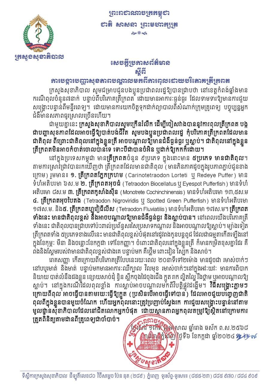 ភ្នំពេញ៖ ក្រសួងសុខាភិបាល នៅថ្ងៃទី ៦ ខែកក្កដា ឆ្នាំ២០២៤នេះ បានប្រកាសឲ្យពលរដ្ឋប្រុងប្រយ័ត្ន និងការបង្ការបញ្ហាសុខភាព ដែលបណ្តាលមកពីការពុលដោយបរិភោគត្រីក្រពត។ ក្រសួងសុខាភិបាល បានឱ្យដឹងថា នៅខេត្តកំពង់ឆ្នាំង មានករណីពុល ចំនួន៧នាក់ បន្ទាប់ពីបរិភោគត្រីក្រពត ដោយមានអាការៈធ្ងន់ធ្ងរ ដែលទាមទារឱ្យមានការជួយ សង្គ្រោះបន្ទាន់ពីមន្ទីរពេទ្យ។ ដោយមានការយកចិត្តទុកដាក់ព្យាបាលពីសំណាក់ក្រុមគ្រូពេទ្យ បច្ចុប្បន្នអ្នក ជំងឺមានសភាពធូរស្រាលច្រើនហើយ។