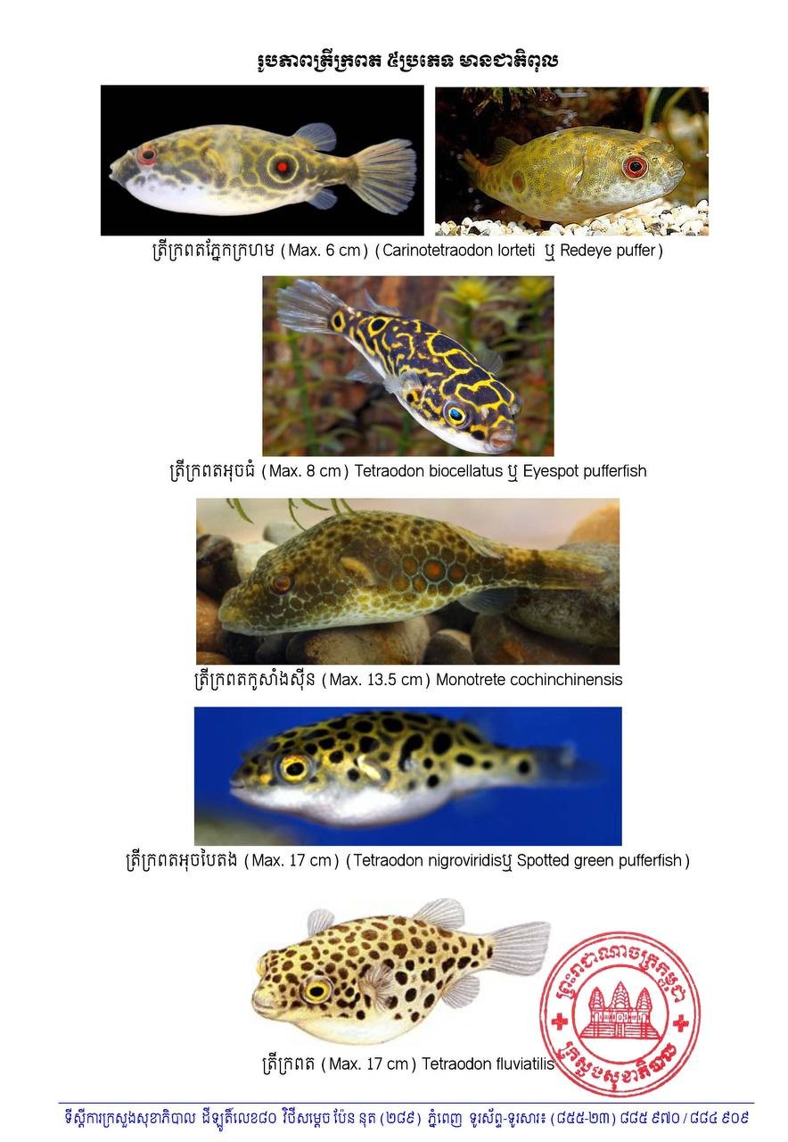 នៅក្នុងប្រទេសកម្ពុជា មានត្រីក្រពតចំនួន ៩ប្រភេទ ក្នុងនោះមាន ៥ប្រភេទ មានជាតិពុល។ តាមការស្រាវជ្រាវបានរកឃើញថា ត្រីក្រពតដែលមានជាតិពុល (មានភិនភាគដូចក្នុងរូបភាពភ្ជាប់ជូនខាង ក្រោម) រួមមាន៖ ១. ត្រីក្រពតភ្នែកក្រហម (Carinotetraodon Lorteti ឬ Redeye Puffer) មាន ទំហំអតិបរមា ៦ស.ម ២. ត្រីក្រពតអុចធំ (Tetraodon Biocellatus ឬ Eyespot Pufferfish) មានទំហំ អតិបរមា ៨ស.ម ៣. ត្រីក្រពតកូសាំងស៊ីន (Monotrete Cochinchinensis) មានទំហំអតិបរមា ១៣,៥ស.ម ៤. ត្រីក្រពតអុចបៃតង (Tetraodon Nigroviridis ឬ Spotted Green Pufferfish) មានទំហំអតិបរមា ១៧ស.ម. និង៥. ត្រីក្រពតហ្គូវៀធីលីស (Tetraodon Fluviatilis) មានទំហំអតិបរមា ១៧ស.ម។ ត្រីក្រពត ទាំងនេះ មានជាតិពុលខ្ពស់ នឹងអាចបណ្តាលឱ្យមានជំងឺធ្ងន់ធ្ងរ និងស្លាប់បាន។ នៅពេលយើងបរិភោគត្រី ទាំងនេះ ជាតិពុលបានជ្រាបទៅប៉ះពាល់ប្រព័ន្ធសរសៃប្រសាទកណ្តាល និងអាចបណ្តាលឱ្យស្លាប់។ ម្យ៉ាងទៀត ត្រីក្រពតទាំង ៥ប្រភេទខាងលើនេះ មានជាតិពុលខ្ពស់បំផុតនៅរដូវពងកូនបន្តពូជ ដែលជាធម្មតាកើតឡើងនៅ ក្នុងខែកុម្ភៈ មីនា និងចន្លោះខែកក្កដា ទៅខែកញ្ញា។ ចំពោះជាតិពុលនៅក្នុងខ្លួនត្រី ក៏មានកម្រិតខុសគ្នាដែរ គឺ ពងនិងស្គមរបស់វាមានជាតិពុលខ្ពស់ជាងគេ បន្ទាប់មក គឺថ្លើម ពោះវៀន ស្បែក និងសាច់។