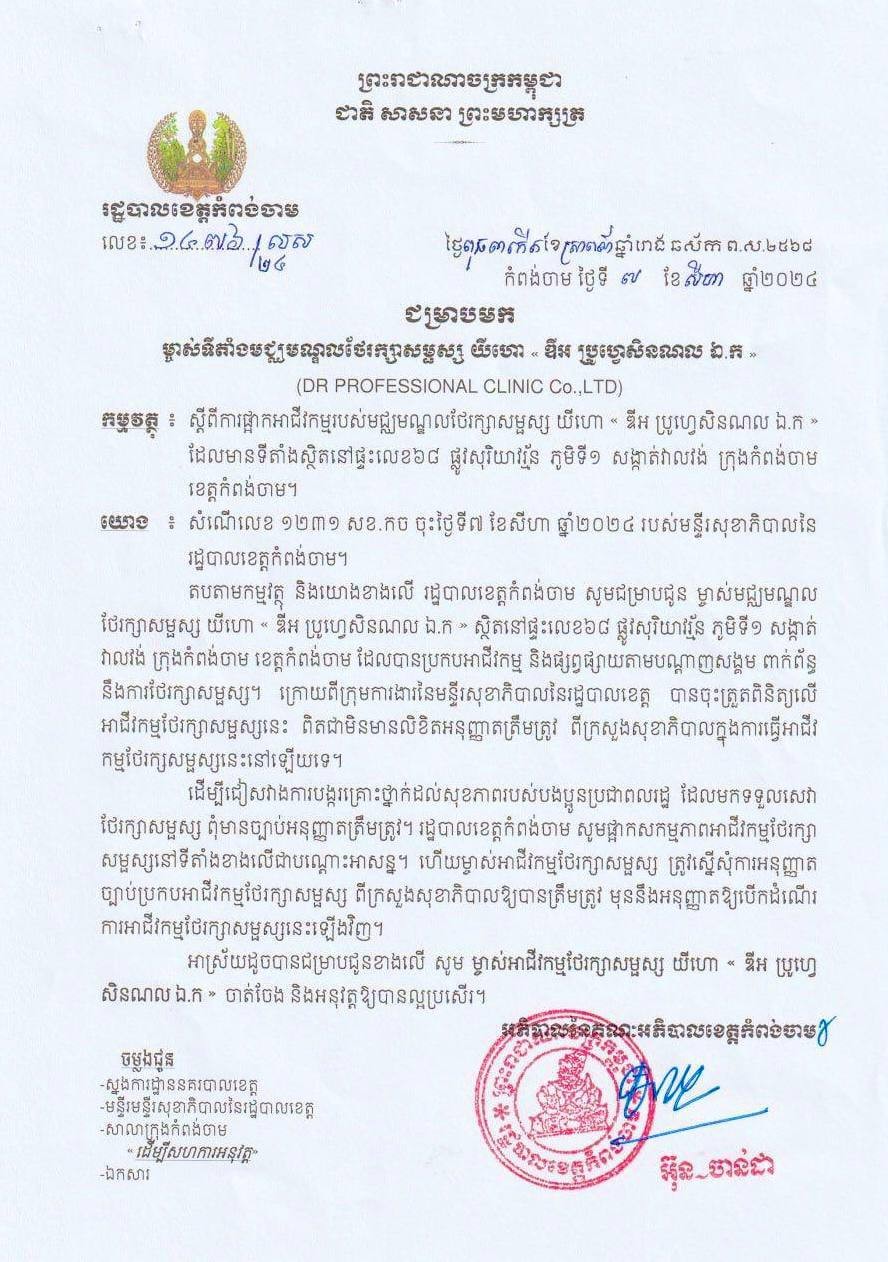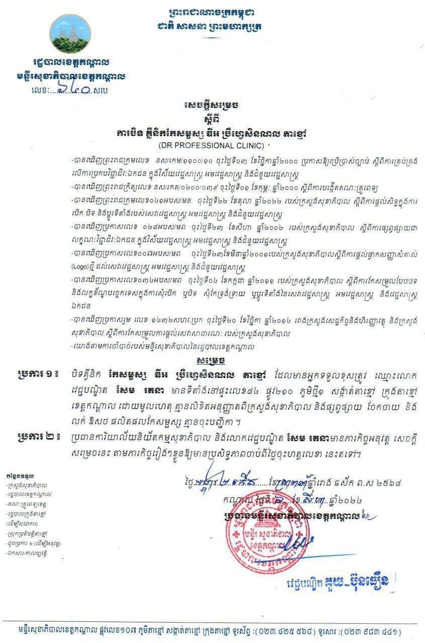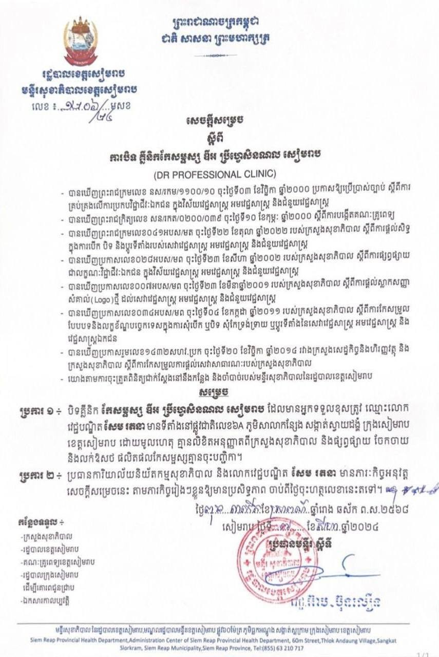 ទី២៖ គ្លីនិកកែសម្ផស្ស ឌីអ ប្រឺហ្វេសិនណល សៀមរាប ដែលមានអ្នកទទួលខុសត្រូវ ឈ្មោះលោក វេជ្ជបណ្ឌិត សែម រតនា មានទីតាំងនៅផ្លូវជាតិលេខ៦A ភូមិសាលាកន្សែង សង្កាត់ស្វាយដង្គំ ក្រុងសៀមរាប ខេត្តសៀមរាប ដោយមូលហេតុ គ្មានលិខិតអនុញ្ញាតពីក្រសួងសុខាភិបាល ។