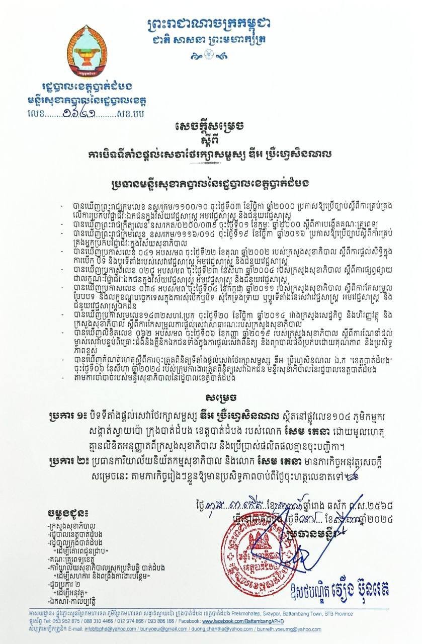 ក្រសួងសុខាភិបាល បានសម្រេចបិទមជ្ឈមណ្ឌលកែសម្ផស្ស មជ្ឈមណ្ឌលថែរក្សាសម្ផស្ស និងគ្លីនិកថែរក្សាកែសម្ផស្សចំនួន ៦ទីតាំង
