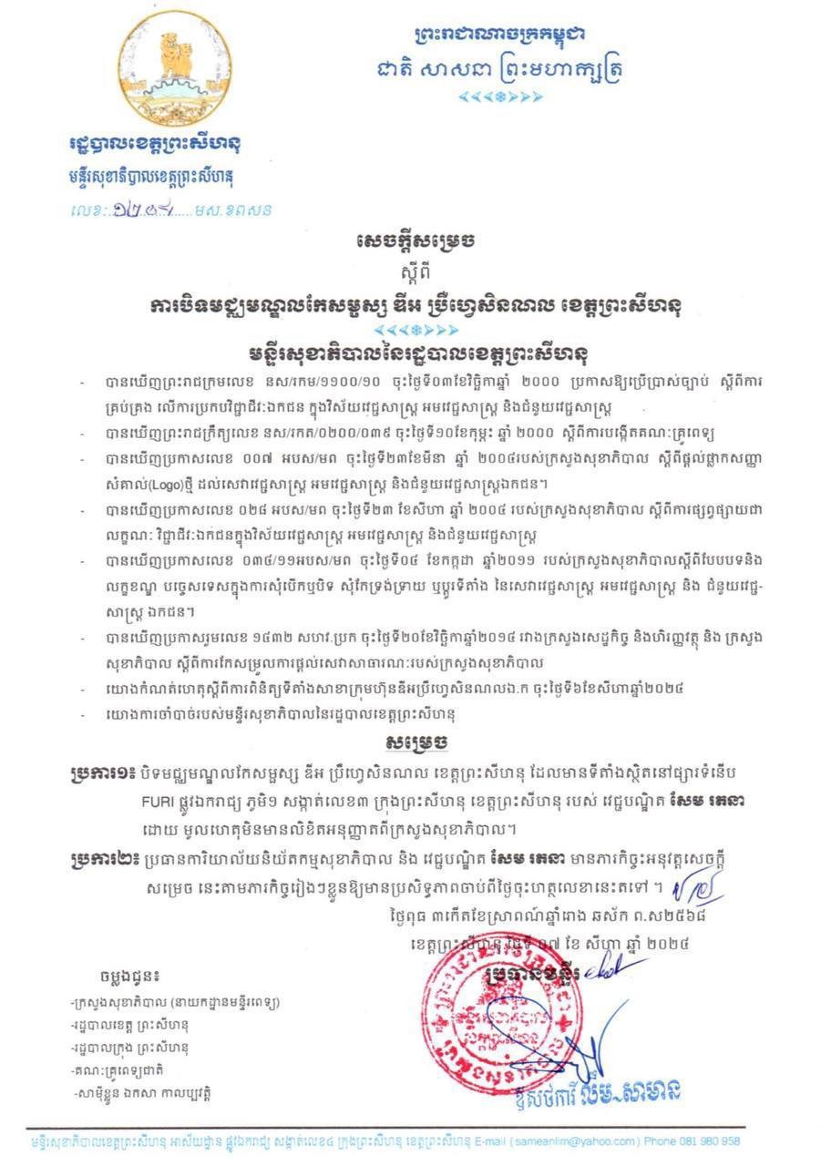 ទី៣៖ មជ្ឈមណ្ឌលកែសម្ផស្ស ឌីអ ប្រីហ្វេសិនណល ខេត្តព្រះសីហនុ ដែលមានទីតាំងស្ថិតនៅផ្សារទំនើប FURI ផ្លូវឯករាជ្យ ភូមិ១ សង្កាត់លេខ៣ ក្រុងព្រះសីហនុ ខេត្តព្រះសីហនុ របស់ វេជ្ជបណ្ឌិត សែម រតនា ដោយមូលហេតុមិនមានលិខិតអនុញ្ញាតពីក្រសួងសុខាភិបាល។