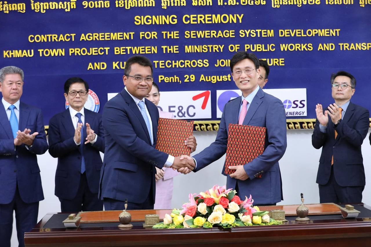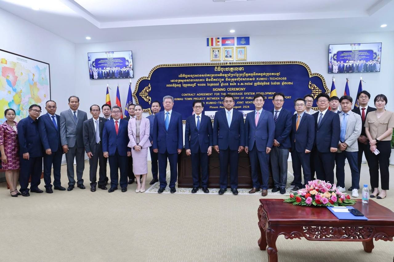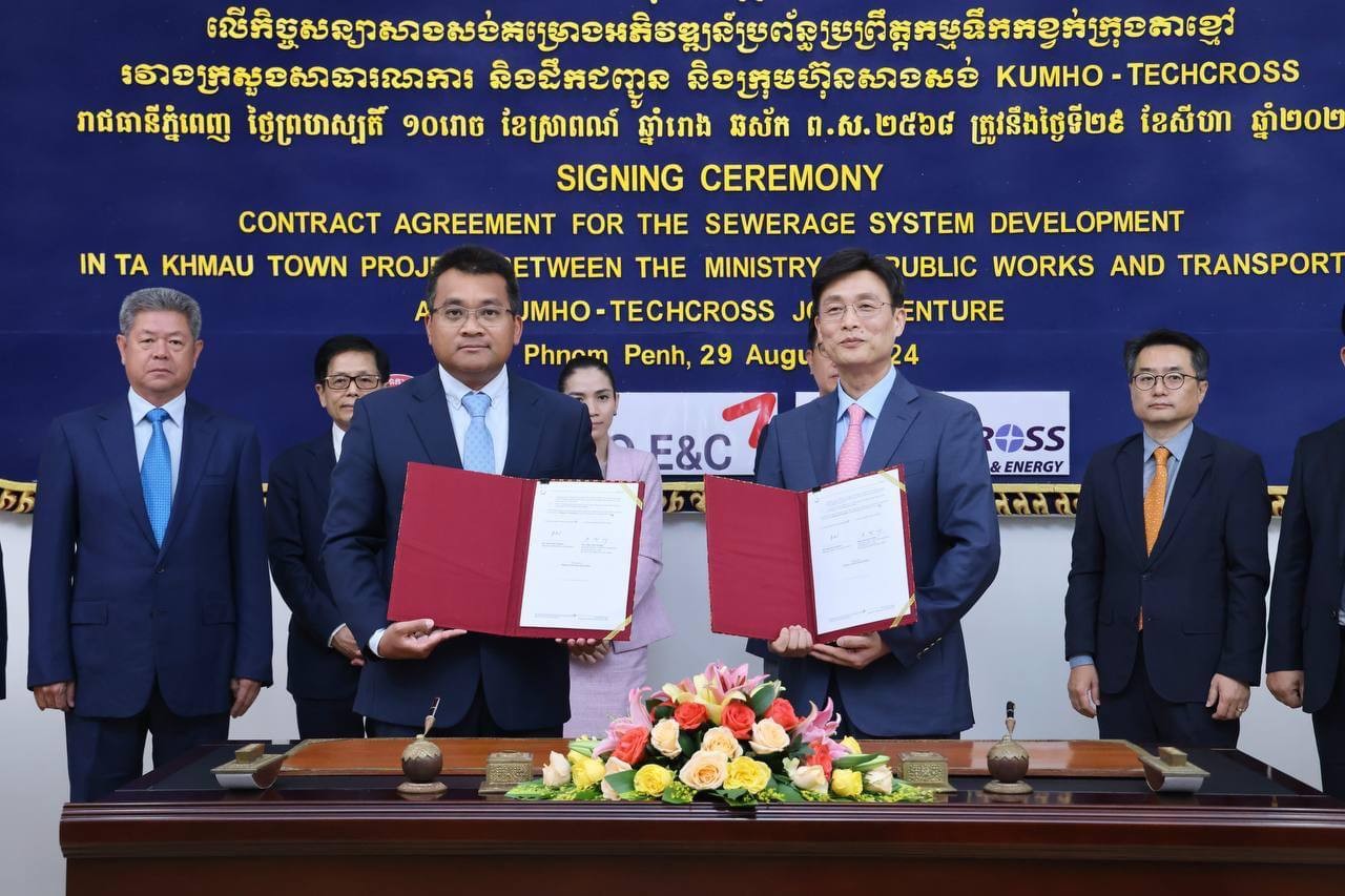 គម្រោងអភិវឌ្ឍន៍ប្រព័ន្ធប្រព្រឹត្តកម្មទឹកកខ្វក់ក្រុងតាខ្មៅ ខេត្តកណ្តាល ត្រូវបានចុះហត្ថលេខាសាងសង់ជាផ្លូវការ រវាងក្រសួងសាធារណការ និងក្រុមហ៊ុនសាងសង់ KUMHO-TECHCROSS Joint Venture