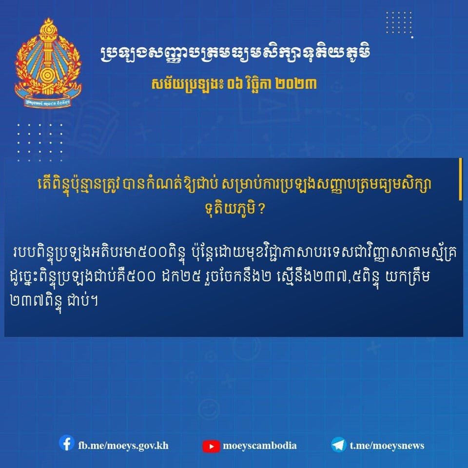 ភ្នំពេញ៖ ខណៈការប្រឡងសញ្ញាបត្រមធ្យមសិក្សាទុតិយភូមិកំពុងតែដំណើរការ ក្រសួងអប់រំ យុវជន និងកីឡា បានប្រកាសកំណត់យកពិន្ទុ២៣៧ ជាពិន្ទុជាប់នៅក្នុងការប្រឡងសញ្ញាបត្រមធ្យមសិក្សាទុតិយភូមិ (បាក់ឌុប) សម័យប្រឡង ៖០៨ តុលា ២០២៤។