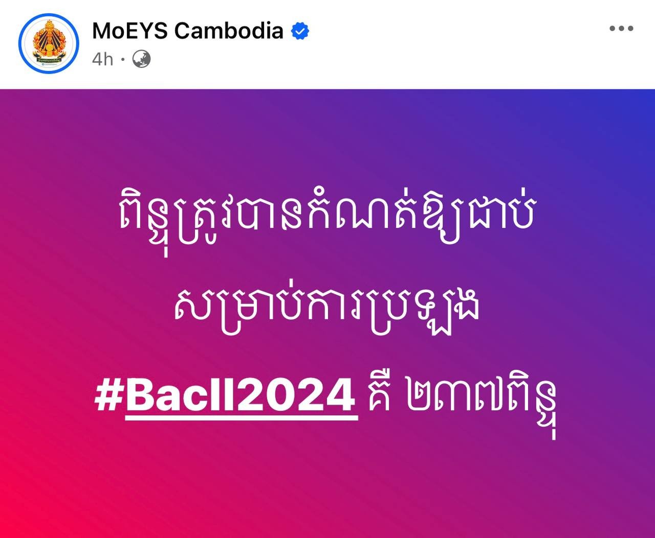 សូមរម្លឹកថា កាលពីប្រឡងបាក់ឌុប សម័យប្រឡង៖ ០៦-០៧ វិច្ឆិកា ២០២៣ ក្រសួងអប់រំ យុវ ជន និងកីឡា បានកំណត់យកពិន្ទុ២៣៧ដូចគ្នានឹងសម័យប្រឡង៖ ០៨ តុលា ២០២៤ដែរ។ ដោយកាលណោះក្រសួងបានបង្ហាញពីរបបពិន្ទុប្រឡងអតិបរមា៥០០ពិន្ទុ ប៉ុន្តែដោយមុខវិជ្ជាភាសាបរទេសជាវិញ្ញាសាតាមស្ម័គ្រ ដូច្នេះពិន្ទុប្រឡងជាប់គឺ៥០០ដក២៥ រួចចែកនឹង២ ស្មើនឹង២៣៧,៥ពិន្ទុ តែក្រសួងកំណត់យកត្រឹម២៣៧ពិន្ទុប៉ុណ្ណោះជាពិន្ទុជាប់។