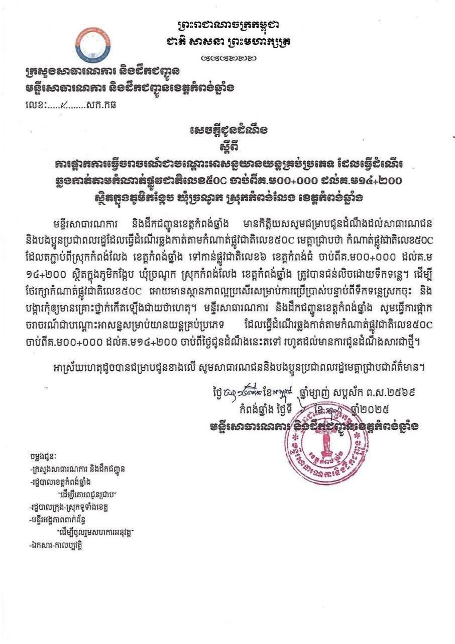 ដើម្បីថែរក្សាកំណាត់ផ្លូវជាតិលេខ ៥០C ឲ្យមានស្ថានភាពល្អប្រសើរសម្រាប់ការប្រើប្រាស់ បន្ទាប់ពីទឹកទន្លេស្រកចុះ និងបង្ការកុំឲ្យមានគ្រោះថ្នាក់កើតឡើងជាយថាហេតុ មន្ទីរសាធារណការ និងដឹកជញ្ជូន ខេត្តកំពង់ឆ្នាំង បានសម្រេចផ្អាកជាបណ្តោះអាសន្ន សម្រាប់យានយន្តគ្រប់ប្រភេទ ចាប់ពីថ្ងៃទី៦ ខែតុលា ឆ្នាំ២០២៥ តទៅរហូតដល់មានការជូនដំណឹងជាថ្មី ទើបបើកឲ្យធ្វើចរារណ៍ឡើងវិញ៕