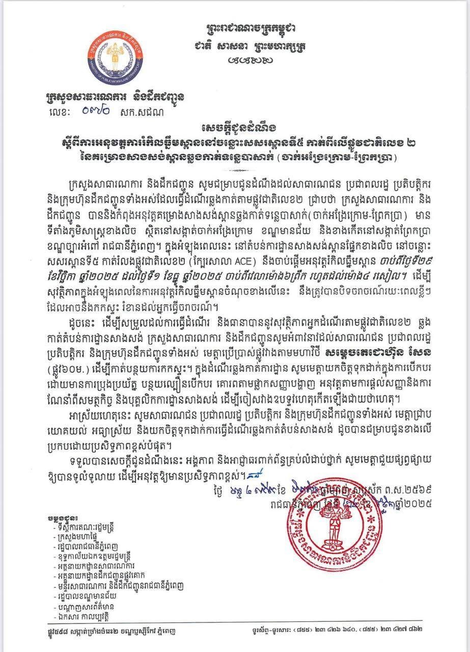 ភ្នំពេញ៖ ក្រសួងសាធារណការ និងដឹកជញ្ជូន បានប្រកាសឱ្យដឹងថា តំបន់ការដ្ឋានសាងសង់ស្ពានឆ្លងកាត់ទន្លេបាសាក់ (ចាក់អង្រែក្រោម-ព្រែកប្រា) ផ្នែកខាងលិច នៅចន្លោះ សសរស្ពានទី៥ កាត់រំលងផ្លូវជាតិលេខ២ (ក្បែរសាលា ACE) នឹងចាប់ផ្តើមអនុវត្តរំកិលផ្ទឹមស្ពាន ចាប់ពីថ្ងៃទី២៩ ខែវិច្ឆិកា ឆ្នាំ២០២៥ ដល់ថ្ងៃទី១ ខែធ្នូ ឆ្នាំ២០២៥ ចាប់ពីវេលាម៉ោង៦ព្រឹក រហូតដល់ម៉ោង៤ រសៀល។ ដើម្បីសុវត្ថិភាពក្នុងអំឡុងពេលនៃការអនុវត្តរំកិលឆ្នើមស្ពានចំណុចខាងលើនេះ នឹងត្រូវបានបិទចរាចរណ៍រយៈពេលខ្លីៗ ដែលអាចនឹងកកស្ទះ រំខានដល់អ្នកធ្វើចរាចរណ៍។