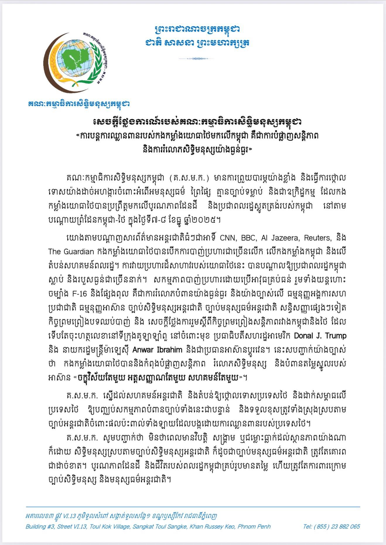 ភ្នំពេញ៖ គណៈកម្មាធិការសិទ្ធិមនុស្សកម្ពុជា (គ.ស.ម.ក.) មានការព្រួយបារម្ភយ៉ាងខ្លាំង និងធ្វើការថ្កោលទោសយ៉ាងដាច់អហង្ការចំពោះអំពើអមនុស្សធម៌ ព្រៃផ្សៃ គ្មានច្បាប់ទម្លាប់ និងជាឧក្រិដ្ឋកម្ម ដែលកងកម្លាំងយោធាថៃបានប្រព្រឹត្តមកលើបូរណភាពដែនដី និងប្រជាពលរដ្ឋស្លូតត្រង់របស់កម្ពុជា នៅតាមបណ្តោយព្រំដែនកម្ពុជា-ថៃ ក្នុងថ្ងៃទី៧-៨ ខែធ្នូ ឆ្នាំ២០២៥។