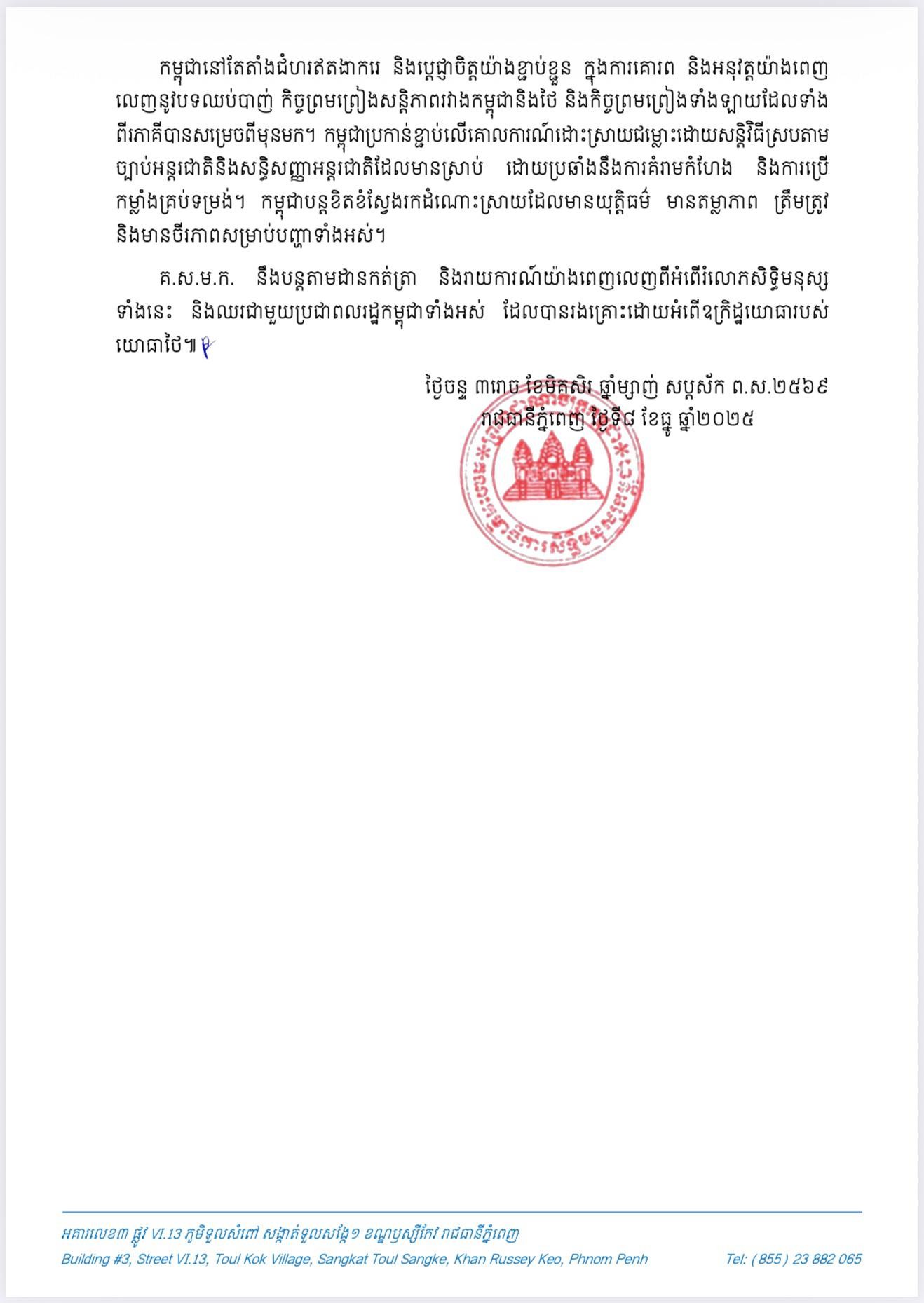 គ.ស.ម.ក. សូមបញ្ជាក់ថា មិនថាពេលមានវិបត្តិសង្គ្រាម ឬជម្លោះធ្លាក់ដល់ស្ថានភាពយ៉ាងណាក៏ដោយ សិទ្ធិមនុស្សស្របតាមច្បាប់សិទ្ធិមនុស្សអន្តរជាតិ ក៏ដូចជាច្បាប់មនុស្សធម៌អន្តរជាតិ ត្រូវតែគោរពជាដាច់ខាត។ បូរណភាពដែនដី និងជីវិតរបស់ពលរដ្ឋកម្ពុជាគ្រប់រូបមានតម្លៃ ហើយត្រូវតែការពារក្រោមច្បាប់សិទ្ធិមនុស្ស និងមនុស្សធម៌អន្តរជាតិ។កម្ពុជានៅតែតាំងជំហរឥតងាករេ និងប្តេជ្ញាចិត្តយ៉ាងខ្ជាប់ខ្ជួន ក្នុងការគោរព និងអនុវត្តយ៉ាងពេញ លេញនូវបទឈប់បាញ់ កិច្ចព្រមព្រៀងសន្តិភាពរវាងកម្ពុជានិងថៃ និងកិច្ចព្រមព្រៀងទាំងឡាយដែលទាំង ពីរភាគីបានសម្រេចពីមុនមក។
