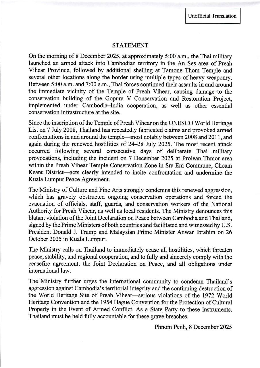 ក្រសួងវប្បធម៌ និងវិចិត្រសិល្បៈ សូមថ្កោលទោសយ៉ាងម៉ឺងម៉ាត់ ចំពោះការរំលោភបំពានសេចក្តីថ្លែងការណ៍រួម ស្តីពីកិច្ចព្រមព្រៀងសន្តិភាព រវាងកម្ពុជា និងថៃ ដែលបានចុះហត្ថលេខា ដោយនាយកដ្ឋមន្ត្រីនៃប្រទេសទាំងពីរ ក្រោមការសម្របសម្រួល និងធ្វើជាសាក្សី ដោយលោក Donald Trump ប្រធានាធិបតីសហរដ្ឋអាមេរិក និងលោក Anwar Ibrahim នាយករដ្ឋមន្ត្រីនៃប្រទេសម៉ាឡេស៊ី កាលពីថ្ងៃទី២៦ ខែតុលា ឆ្នាំ២០២៥ នៅទីក្រុងកូឡាឡាំពួរ ប្រទេសម៉ាឡេស៊ី។