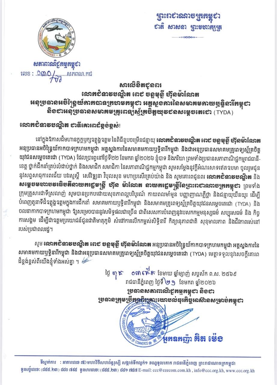 ក្នុងសារលិខិត អ្នកឧកញ៉ា គិតម៉េង បានសរសេរថា “នៅក្នុងឱកាសដ៏មហានក្ខត្តឫក្សឧត្តុង្គឧត្តម នៃពិធីខួបចម្រើនជន្មាយុ លោកជំទាវបណ្ឌិត ពេជ ចន្ទមុន្នី ហ៊ុនម៉ាណែត អនុប្រធានអចិន្ត្រៃយ៍កាកបាទក្រហមកម្ពុជា អគ្គស្នងការនៃសមាគមកាយឫទ្ធិនារីកម្ពុជា និងជាអនុប្រធានសមាគមគ្រូពេទ្យស្ម័គ្រចិត្ត យុវជនសម្តេចតេជោ (TYDA) ដែលប្រារព្ធនៅថ្ងៃទី២២ ខែមករា ឆ្នាំ២០២៦ ខ្ញុំបាទ និងភរិយា ព្រមទាំងប្រធានសភាពាណិជ្ជកម្មរាជធានី- ខេត្ត ថ្នាក់ដឹកនាំគ្រប់លំដាប់ថ្នាក់ និងសមាជិកសមាជិកា នៃសភាពាណិជ្ជកម្មកម្ពុជា សូមសម្តែងនូវក្តីអំណរសាទរឥតឧបមា ចូលរួមជូននូវសព្ទសាធុការពរជ័យ បវរសួស្តី សេរីវឌ្ឍនា វិបុលសុខ មហាប្រសើរគ្រប់យ៉ាង និងសូមគោរពជូនពរលោកជំទាវបណ្ឌិត និងសម្តេចមហាបវរធិបតីនាយករដ្ឋមន្ត្រី ហ៊ុន ម៉ាណែត នាយករដ្ឋមន្ត្រីនៃព្រះរាជាណាចក្រកម្ពុជា ព្រមទាំងក្រុមគ្រួសារជាទីស្រលាញ់ សូមបានប្រកបដោយសុខភាពល្អបរិបូរណ៍ កាយពលមាំមួន បញ្ញាញាណភ្លឺថ្លា និងជន្មាយុយឺនយូរ ដើម្បី បំពេញតួនាទីដ៏ឧត្តុង្គឧត្តមក្នុងការដឹកនាំ សមាគមកាយឫទ្ធិនារីកម្ពុជា និងសមាគមគ្រូពេទ្យស្ម័គ្រចិត្តយុវជនសម្តេចតេជោ (TYDA) និង ចលនាកាកបាទក្រហមកម្ពុជា ឱ្យសម្រេចបាននូវសមិទ្ធផលជាច្រើន ជាពិសេសការបំពេញនូវបេសកកម្មមនុស្សធម៌ សប្បុរសធម៌ និងកិច្ចការសង្គម ដើម្បីជាឧត្តមប្រយោជន៍ជូនជាតិមាតុភូមិ សំដៅការលើកកម្ពស់សិទ្ធិនារី កិត្យានុភាពជាតិ សុខុមាលភាព និងជីវភាពរស់នៅ របស់ប្រជាពលរដ្ឋ។