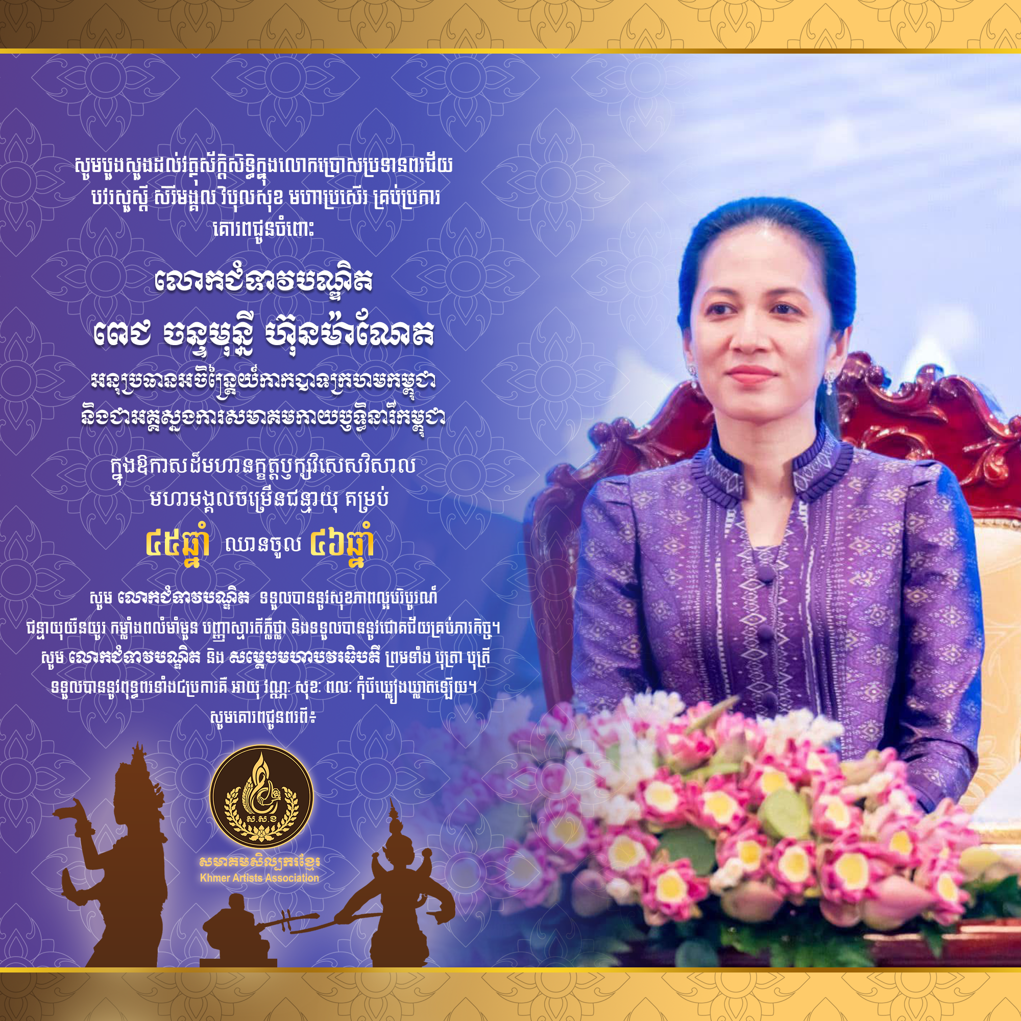ភ្នំពេញ៖ លោកជំទាវ អ្នកឧកញ៉ា ម៉ៅ ចំណាន គិតម៉េង ប្រធានសមាគមសិល្បករខ្មែរ បានផ្ញើសារលិខិតជូនពរលោកជំទាវបណ្ឌិត ពេជ ចន្ទមុន្នី ហ៊ុនម៉ាណែត អនុប្រធានអចិន្ត្រៃយ៍កាកបាទក្រហមកម្ពុជា និងជាអគ្គស្នងការសមាគមកាយឫទ្ធិនារីកម្ពុជា ក្នុងឱកាសខួបចម្រើនជន្មាយុ។