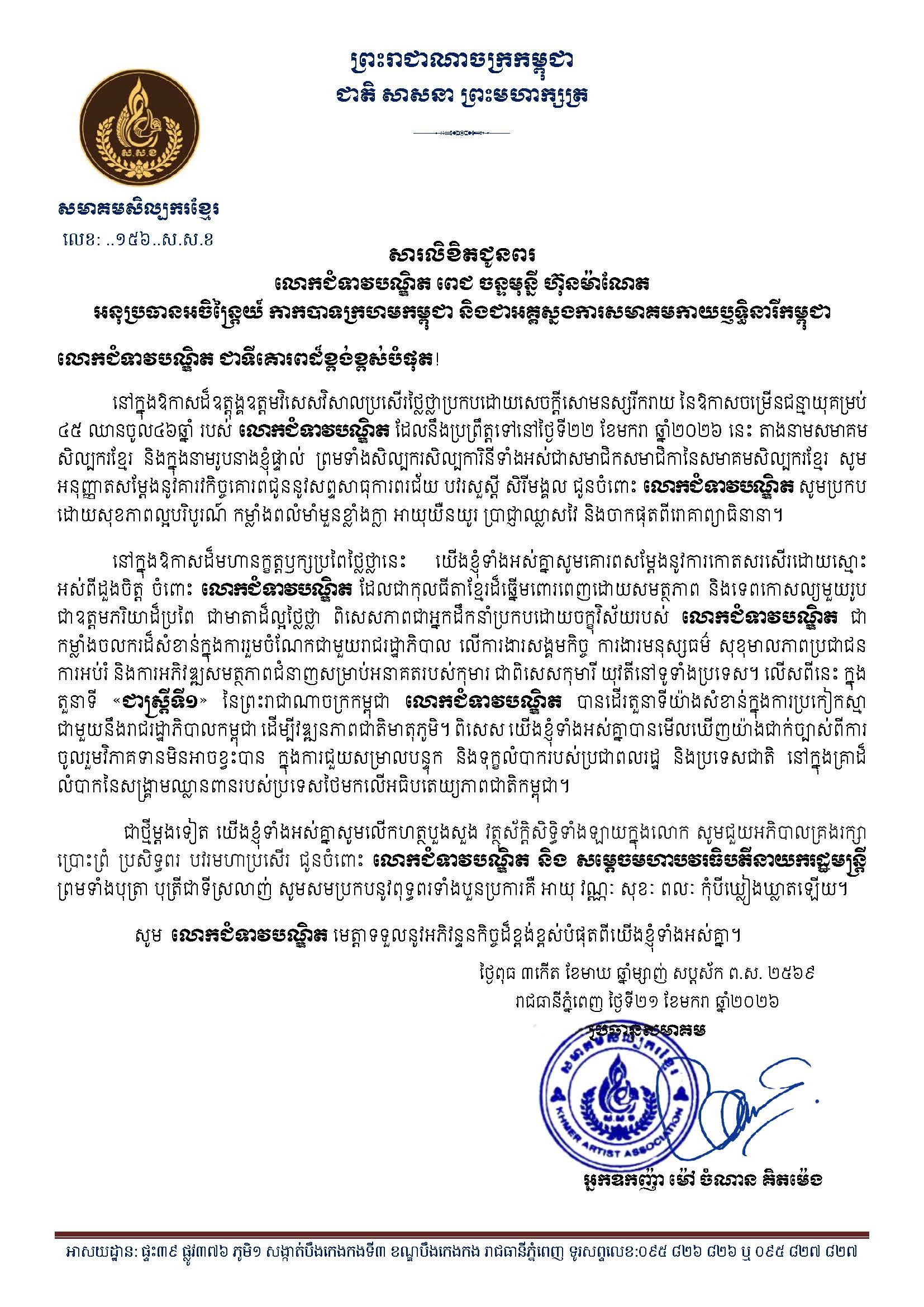 ក្នុងសារលិខិត លោកជំទាវ អ្នកឧកញ៉ា ម៉ៅ ចំណាន គិតម៉េង បានលើកឡើងថា “នៅក្នុងឱកាសដ៏ឧត្តុង្គឧត្តមវិសេសវិសាលប្រសើរថ្លៃថ្លាប្រកបដោយសេចក្តីសោមនស្សរីករាយ នៃឱកាសចម្រើនជន្មាយុគម្រប់ ៤៥ ឈានចូល ៤៦ឆ្នាំ របស់ លោកជំទាវបណ្ឌិត ដែលនឹងប្រព្រឹត្តទៅនៅថ្ងៃទី២២ ខែមករា ឆ្នាំ២០២៦នេះ តាងនាមសមាគមសិល្បករខ្មែរ និងក្នុងនាមរូបនាងខ្ញុំផ្ទាល់ ព្រមទាំងសិល្បករសិល្បការិនីទាំងអស់ជាសមាជិកសមាជិកានៃសមាគមសិល្បករខ្មែរ សូមអនុញ្ញាតសម្តែងនូវគារវកិច្ចគោរពជូននូវសព្ទសាធុការពរជ័យ បវរសួស្តី សិរីមង្គល ជូនចំពោះលោកជំទាវបណ្ឌិត សូមប្រកបដោយសុខភាពល្អបរិបូរណ៍ កម្លាំងពលំមាំមួនខ្លាំងក្លា អាយុយឺនយូរ ប្រាជ្ញាឈ្លាសវៃ និងចាកផុតពីរោគាព្យាធិនានា។