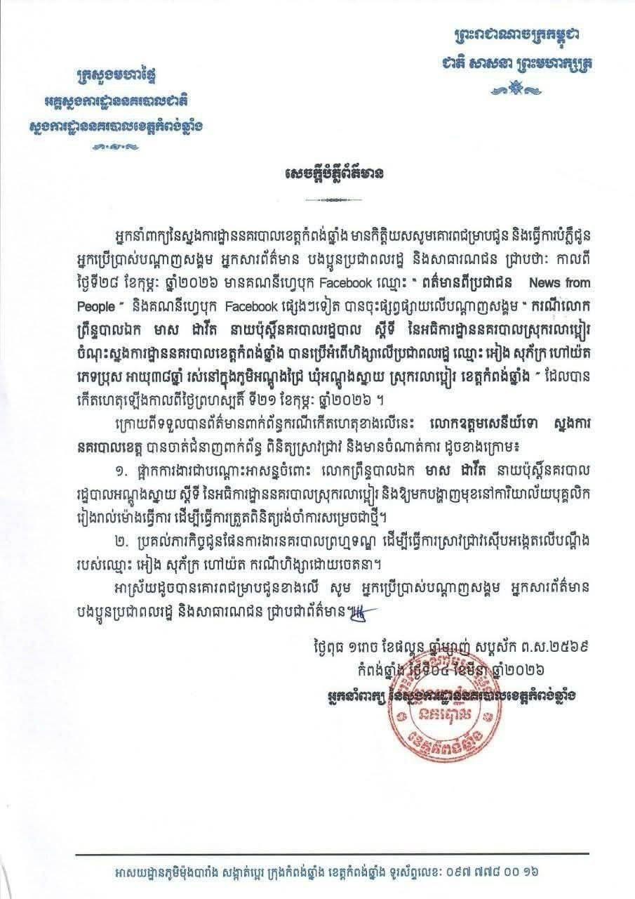 ការដ្ឋានគរបាលខេត្តកំពង់ឆ្នាំង នៅថ្ងៃទី៤ ខែមីនា ឆ្នាំ២០២៦ បានឲ្យដឹងថា មានការផ្សព្វ