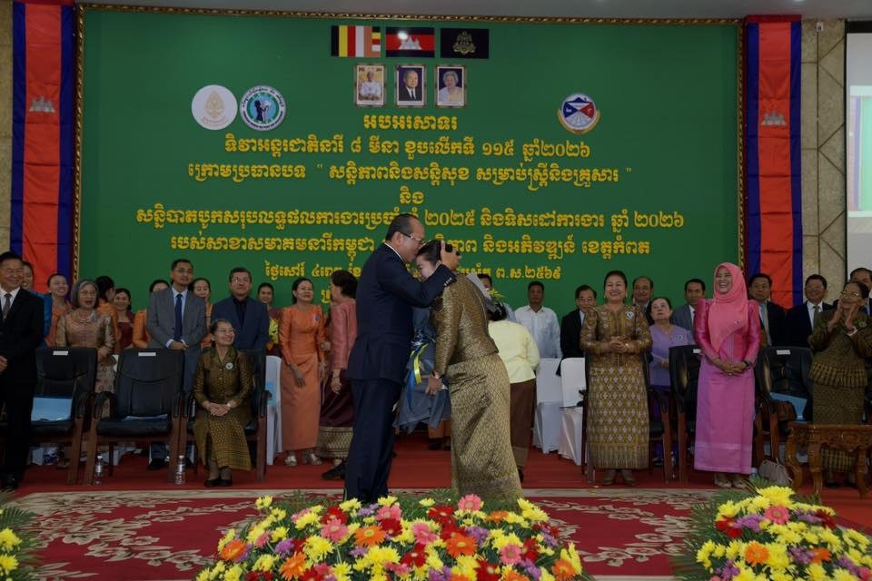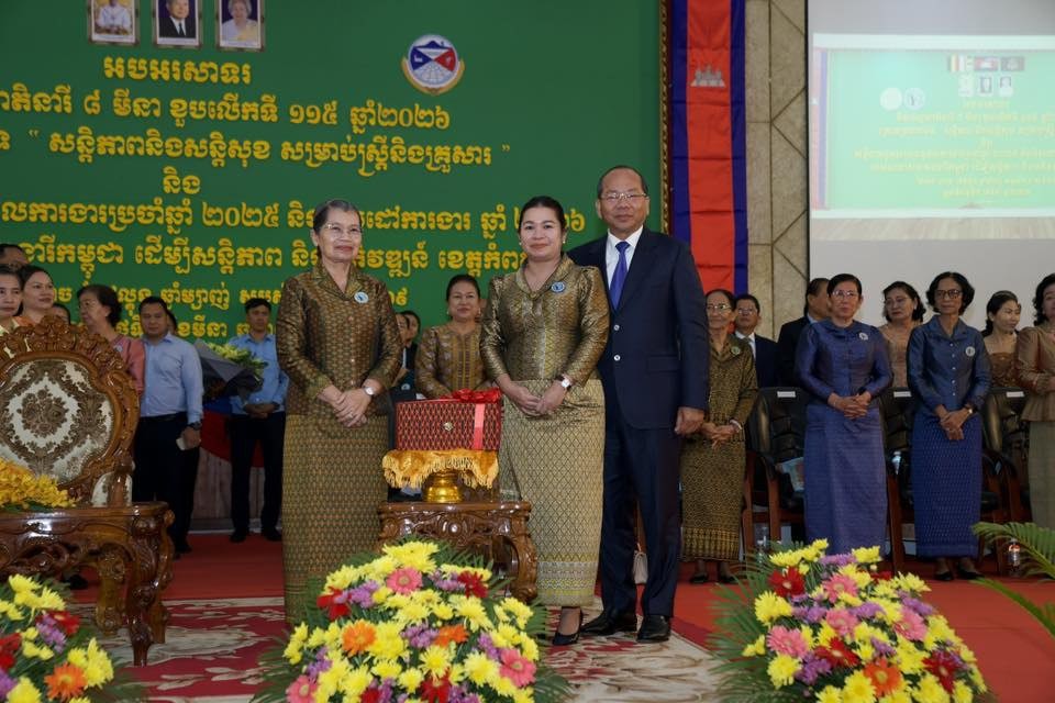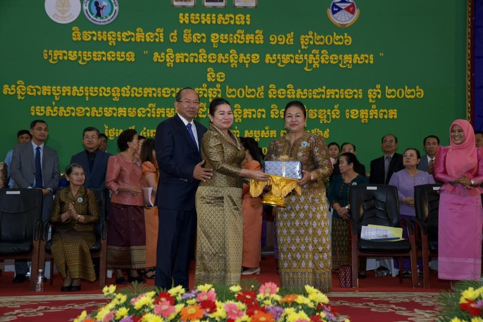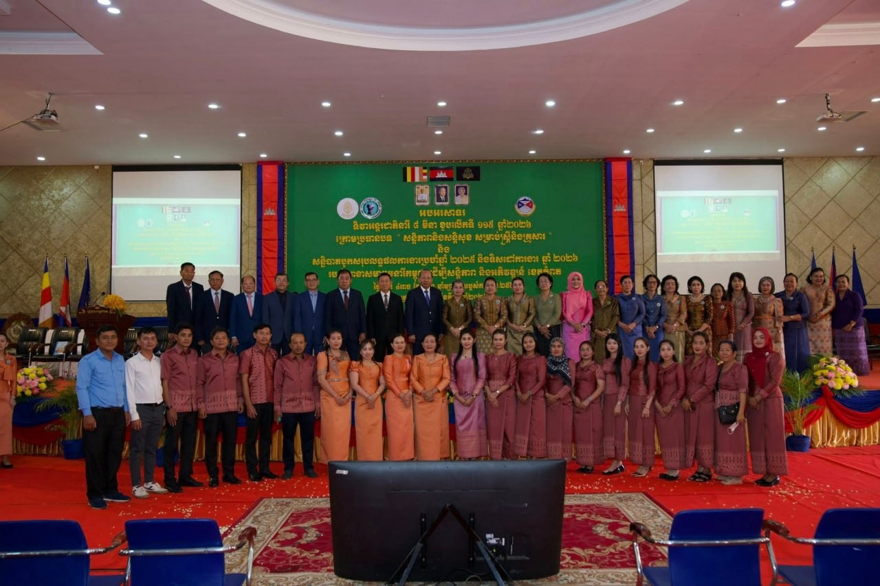 កំពត៖ សម្តេចកិត្តិសង្គហបណ្ឌិត ម៉ែន សំអន ឧត្តមប្រឹក្សាផ្ទាល់ព្រះមហាក្សត្រ និងជាប្រធានសមាគមនារីកម្ពុជា ដើម្បីសន្តិភាព និងអភិវឌ្ឍន៍ បានអញ្ជើញជាអធិបតីក្នុងពិធីអបអរសាទរខួបលើកទី១១៥ ទិវាអន្តរជាតិនារី ៨មីនា ឆ្នាំ២០២៦ ក្រោមប្រធានបទ “សន្តិភាព និងសន្តិសុខសម្រាប់ស្ត្រី និងគ្រួសារ” និងសន្និបាតបូកសរុបលទ្ធផលការងារប្រចាំឆ្នាំ២០២៥ និងលើកទិសដៅបន្តឆ្នាំ២០២៦ របស់សាខាសមាគមនារីកម្ពុជា ដើម្បីសន្តិភាព និងអភិវឌ្ឍន៍ខេត្តកំពត ដែលមានពិធីនេះបានធ្វើឡើងនៅព្រឹកថ្ងៃទី៧ ខែមីនា ឆ្នាំ២០២៦ នាសាលសន្និសីទបូកគោ សាលាខេត្តកំពត។