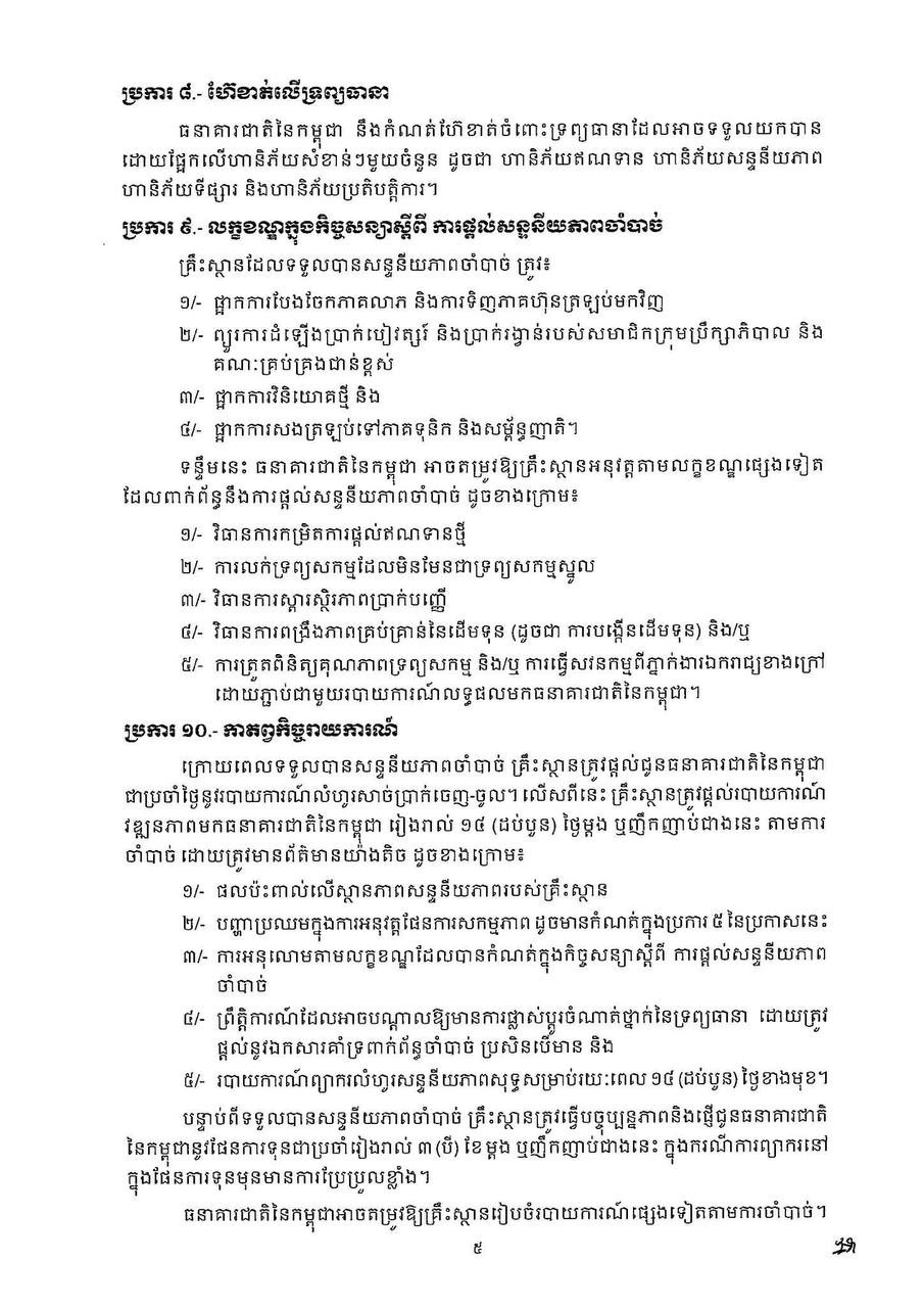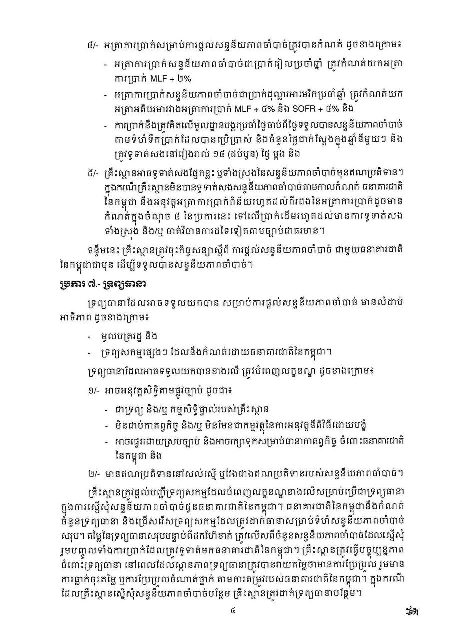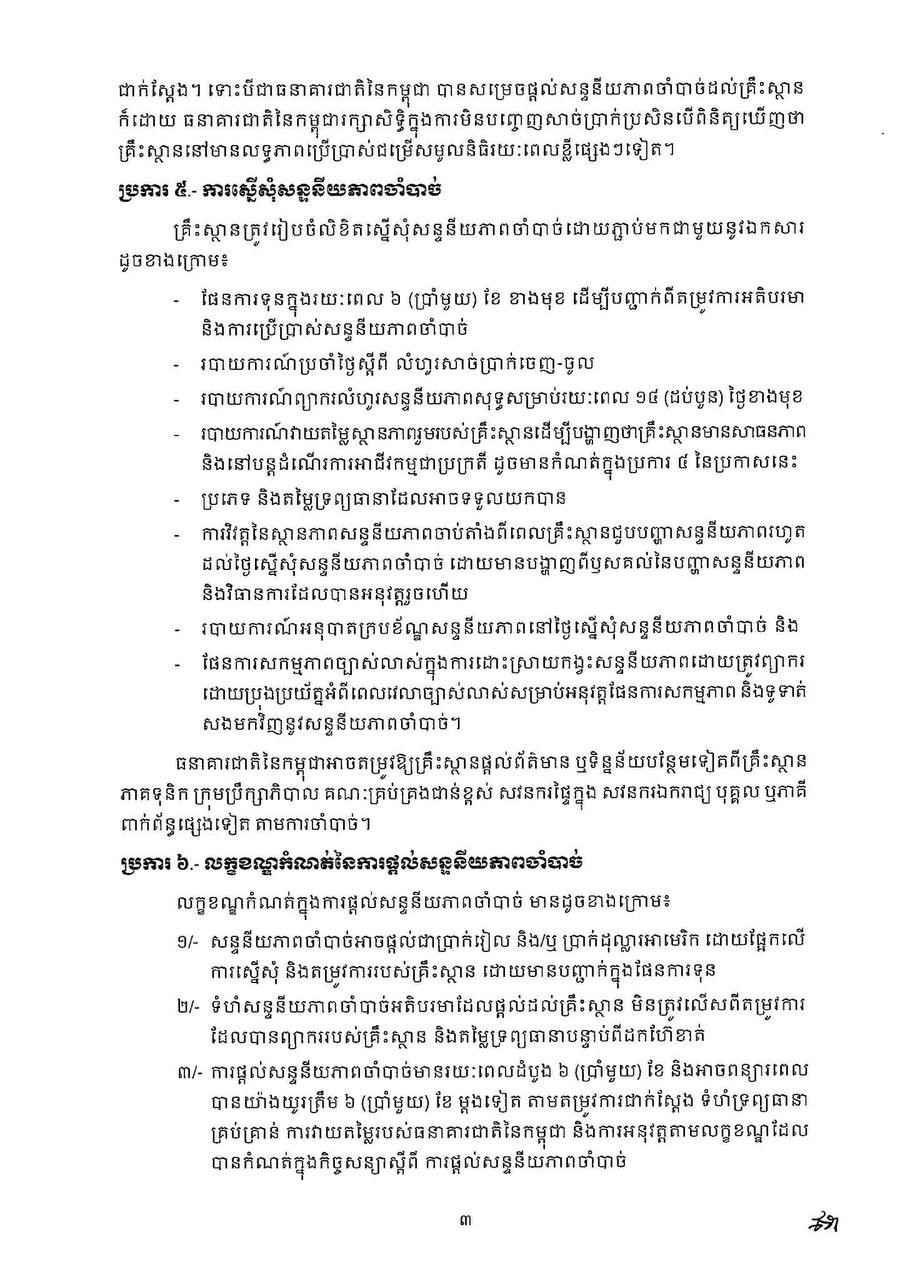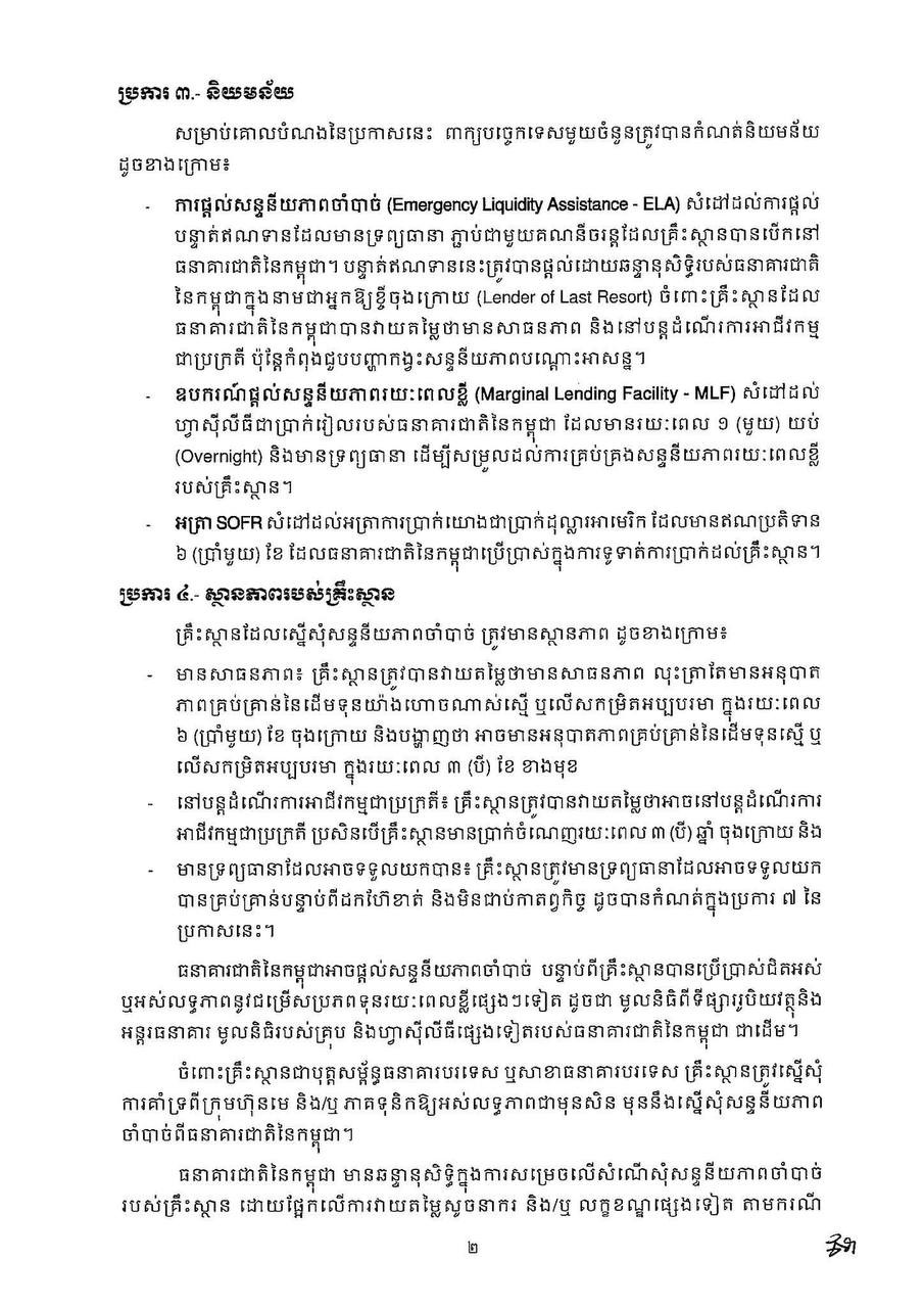 ព័ត៌មានលម្អិតមានភ្ជាប់នៅក្នុងប្រកាសស្តីពី ការផ្តល់សន្ទនីយភាពចាំបាច់ចំពោះគ្រឹះស្ថានធនាគារ និងហិរញ្ញវត្ថុទទួលប្រាក់បញ្ញើ នៅខាងក្រោម៖