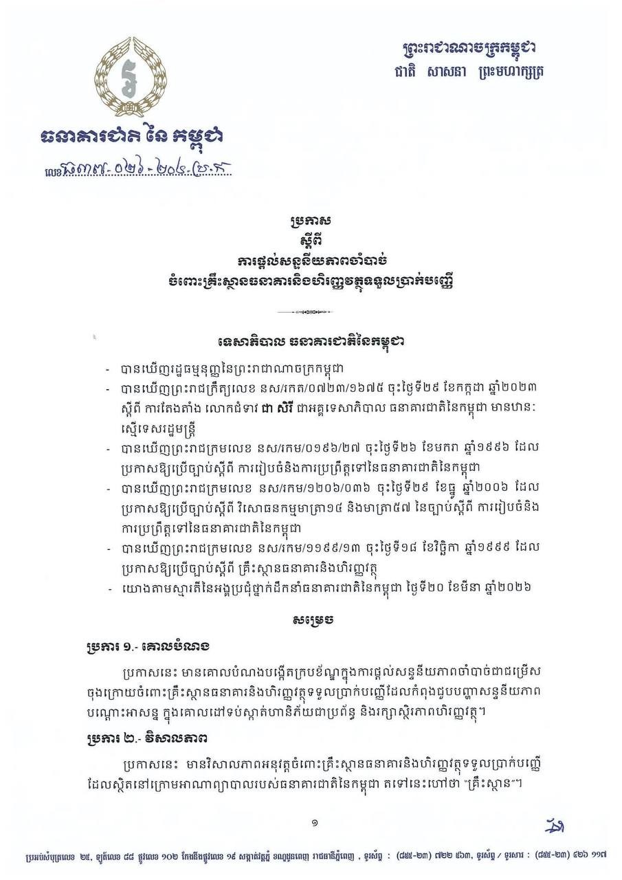 ភ្នំពេញ៖ ធនាគារជាតិនៃកម្ពុជា បានចេញប្រកាសថ្មីមួយ នៅថ្ងៃទី២០ ខែមីនា ឆ្នាំ២០២៦ ដើម្បីផ្តល់ជំនួយសន្ទនីយភាព (ហិរញ្ញវត្ថុ) ចាំបាច់ដល់គ្រឹះស្ថានធនាគារ និងហិរញ្ញវត្ថុទទួលប្រាក់បញ្ញើ នៅពេលជួបបញ្ហាខ្វះសាច់ប្រាក់បណ្ដោះអាសន្ន។