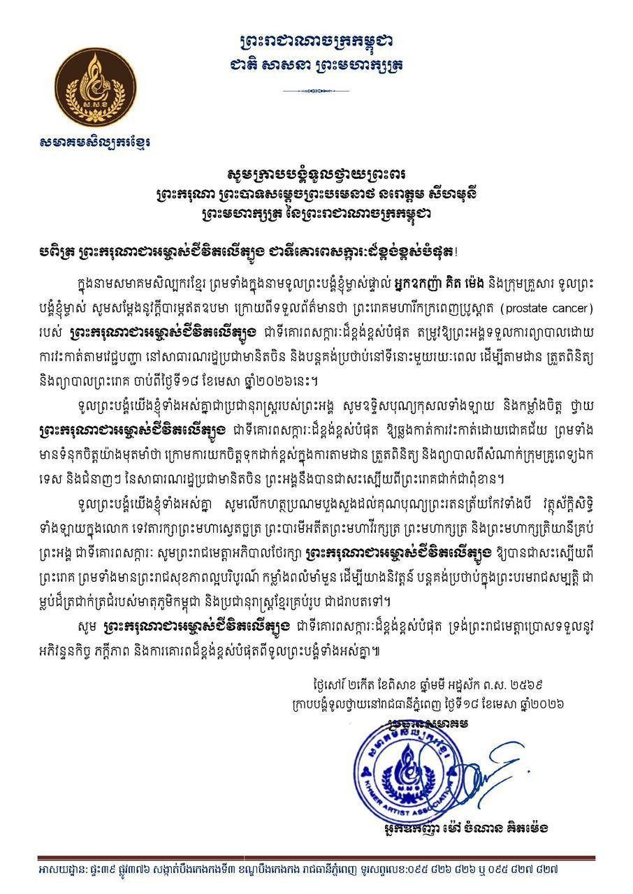ភ្នំពេញ៖ ក្នុងនាមសមាគមសិល្បករខ្មែរ ព្រមទាំងក្នុងនាមទូលព្រះបង្គំខ្ញុំម្ចាស់ផ្ទាល់ លោកជំទាវអ្នកឧកញ៉ា ម៉ៅ ចំណាន គិតម៉េង និងអ្នកឧកញ៉ា គិត ម៉េង ព្រមទាំងក្រុមគ្រួសារ ទូលព្រះបង្គំខ្ញុំម្ចាស់ សូមសម្តែងនូវក្តីបារម្ភឥតឧបមា ក្រោយពីទទួលព័ត៌មានថា ព្រះរោគមហារីកក្រពេញប្រូស្តាត (prostate cancer) របស់ព្រះករុណាជាអម្ចាស់ជីវិតលើត្បូង ជាទីគោរពសក្ការៈដ៏ខ្ពង់ខ្ពស់បំផុត តម្រូវឱ្យព្រះអង្គទទួលការព្យាបាលដោយ ការវះកាត់តាមវេជ្ជបញ្ជា នៅសាធារណរដ្ឋប្រជាមានិតចិន និងបន្តគង់ប្រថាប់នៅទីនោះមួយរយៈពេល ដើម្បីតាមដាន ត្រួតពិនិត្យ និងព្យាបាលព្រះរោគ ចាប់ពីថ្ងៃទី១៨ ខែមេសា ឆ្នាំ២០២៦នេះ។