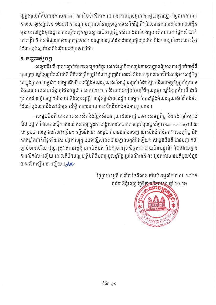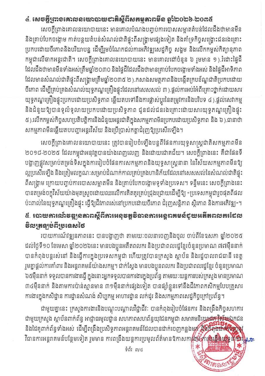 បើយោងតាមសេចក្តីប្រកាសព័ត៌មានស្តីពីលទ្ធផលកិច្ចប្រជុំពេញអង្គគណៈរដ្ឋមន្ត្រី បានបញ្ជាក់ថា "រាជរដ្ឋាភិបាលកម្ពុជា ក្រោមការដឹកនាំរបស់ សម្តេចមហាបវរធិបតី ហ៊ុន ម៉ាណែត នាយករដ្ឋមន្ត្រី នៃ ព្រះរាជាណាចក្រកម្ពុជា បន្តនិរន្តរភាពគោលការណ៍គ្រឹះរបស់ សម្តេចអគ្គមហាសេនាបតីតេជោ ហ៊ុន សែន។ កងយោធពលខេមរភូមិន្ទ បាន និងកំពុងអនុវត្តភារកិច្ចការពារជាតិ ចូលរួមក្នុងការអភិវឌ្ឍសង្គម និងជួយសង្គ្រោះ គ្រប់រូបភាព និងអនុវត្តរាល់បទបញ្ជារបស់រាជរដ្ឋាភិបាលទាន់ពេលវេលា និងមានប្រសិទ្ធភាព"៕
