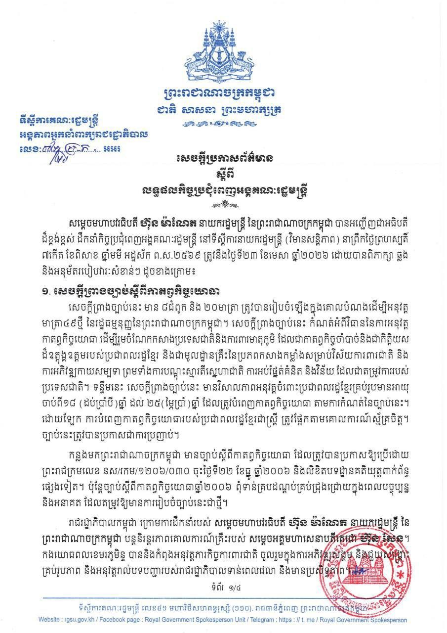 ទន្ទឹមនេះ សេចក្តីព្រាងច្បាប់នេះ មានវិសាលភាពអនុវត្តចំពោះប្រជាពលរដ្ឋខ្មែរគ្រប់រូបមានអាយុ ចាប់ពី១៨ (ដប់ប្រាំបី) ឆ្នាំ ដល់ ២៥(ម្ភៃប្រាំ)ឆ្នាំ ដែលត្រូវបំពេញកាតព្វកិច្ចយោធា តាមការកំណត់នៃច្បាប់នេះ។ នេះបើយោងតាមសេចក្តីប្រកាសព័ត៌មានស្តីពីលទ្ធផលកិច្ចប្រជុំពេញអង្គគណៈរដ្ឋមន្ត្រី ដែលសម្តេចមហាបវរធិបតី ហ៊ុន ម៉ាណែត នាយករដ្ឋមន្ត្រី នៃព្រះរាជាណាចក្រកម្ពុជា បានអញ្ជើញដឹកនាំកិច្ចប្រជុំពេញអង្គគណៈរដ្ឋមន្ត្រី នៅទីស្តីការនាយករដ្ឋមន្ត្រី (វិមានសន្តិភាព) នាព្រឹកថ្ងៃព្រហស្បតិ៍ ត្រូវនឹងថ្ងៃទី២៣ ខែមេសា ឆ្នាំ២០២៦។