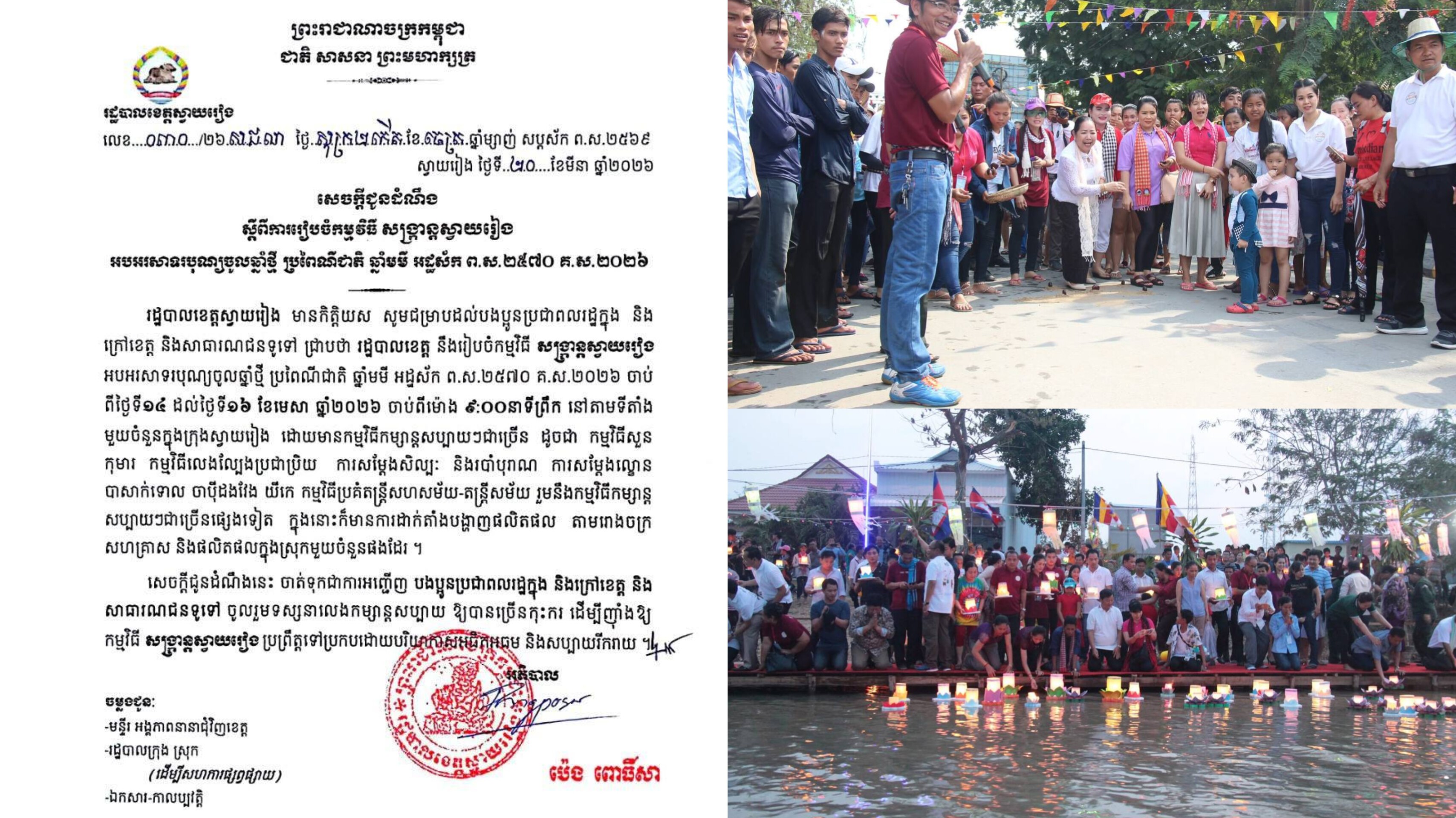 រដ្ឋបាលខេត្តស្វាយរៀង នឹងរៀបចំកម្មវិធី សង្ក្រាន្តស្វាយរៀង ដើម្បីអបអរសាទរបុណ្យចូលឆ្នាំថ្មីប្រពៃណីជាតិ រយៈ ៣ថ្ងៃចាប់ពីថ្ងៃទី១៤ ដល់ថ្ងៃទី១៦ ខែមេសា ខាងមុខនេះ