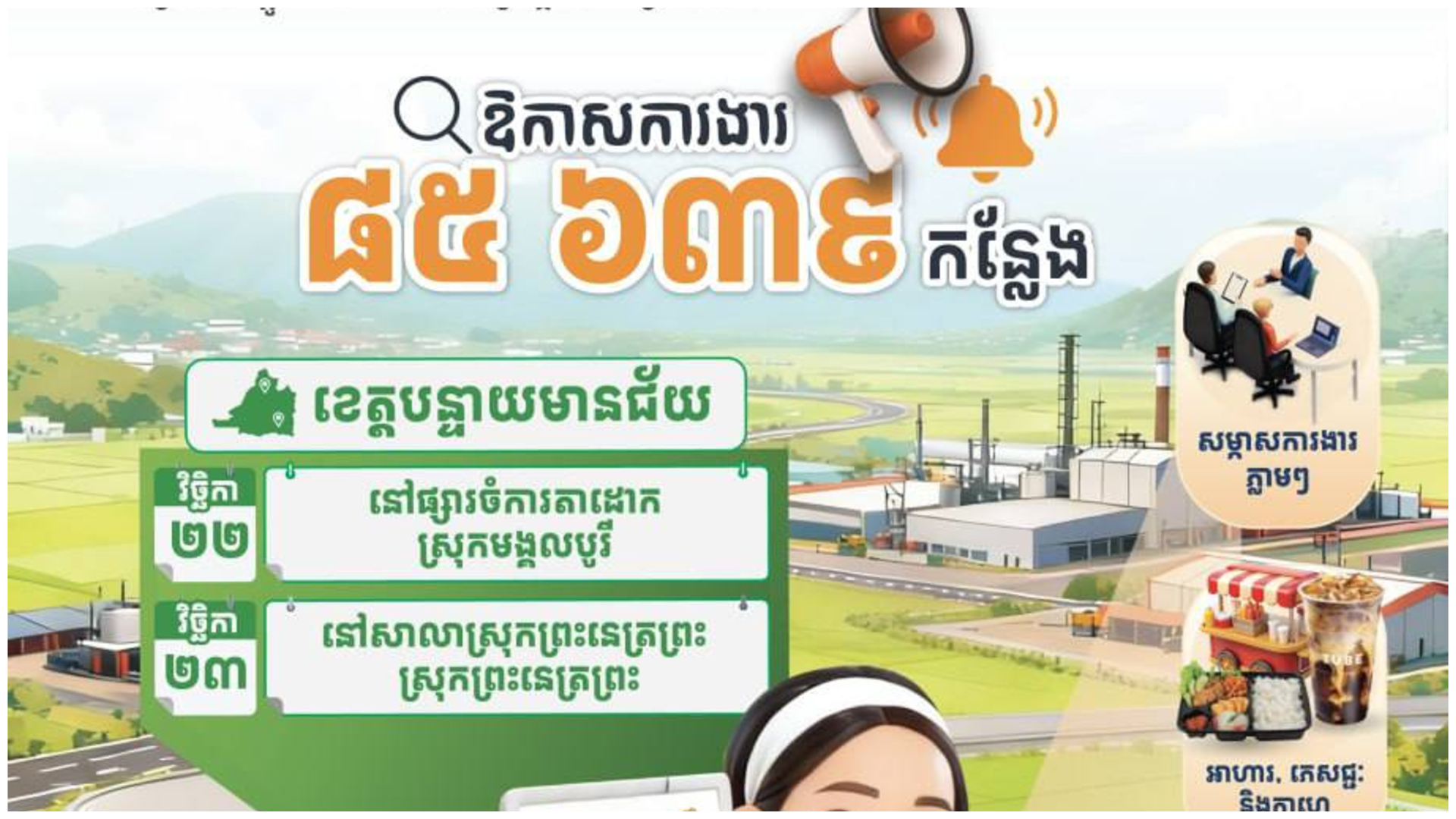 ក្រសួងការងារ នឹងបើកពិព័រណ៍ការងារ សន្តិសុខសង្គម និងបណ្តុះបណ្តាលវិជ្ជាជីវៈ ដោយនាំយកឱកាសការងាររាប់ម៉ឺនកន្លែងជូនអតីតពលករមកពីថៃនៅខេត្តបន្ទាយមានជ័យ