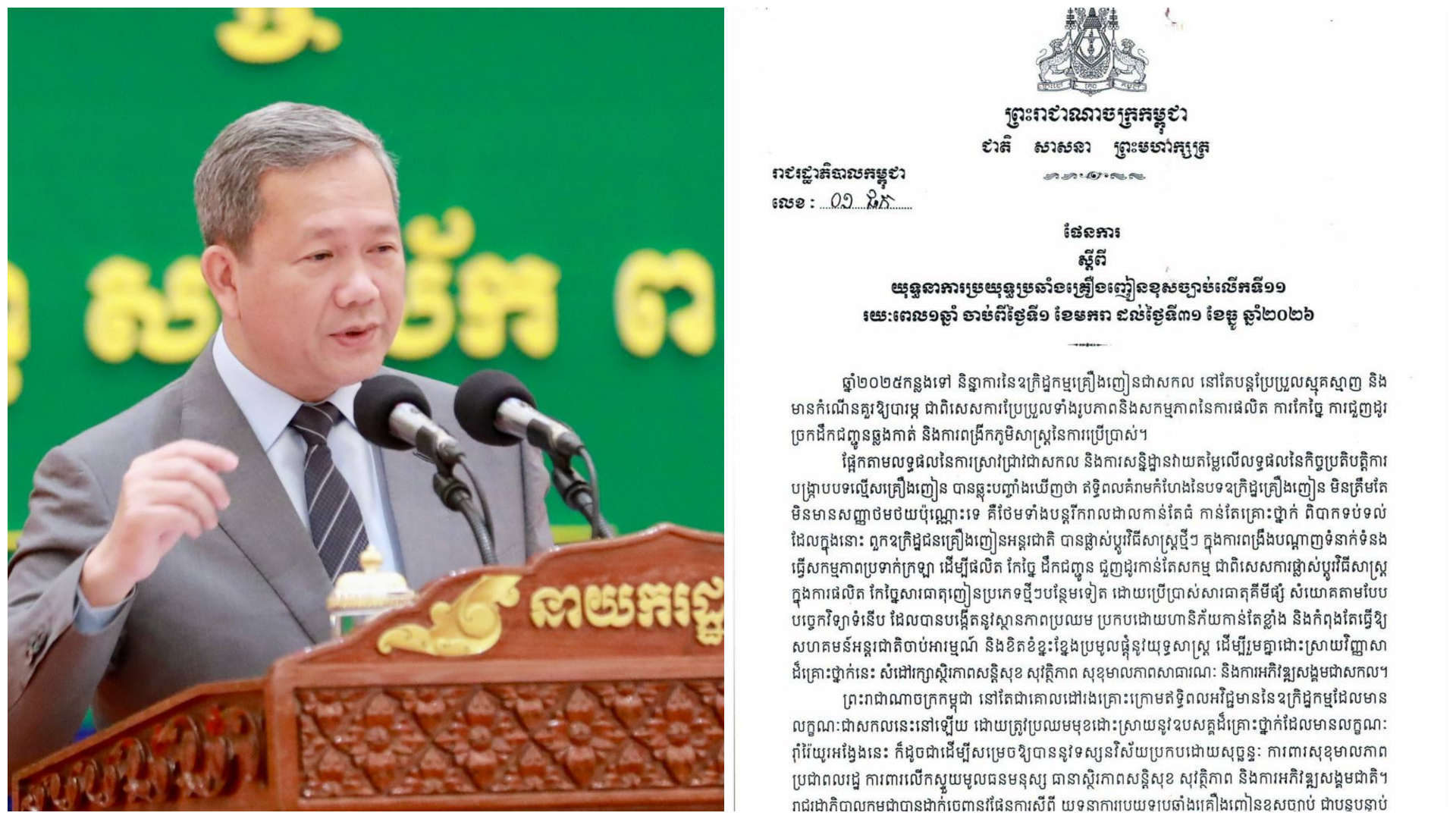 សម្ដេចបវរធិបតី ហ៊ុន ម៉ាណែត នាយករដ្ឋមន្ដ្រី នៃកម្ពុជា បានបន្ដដាក់ចេញនូវយុទ្ធនាការប្រយុទ្ធប្រឆាំងគ្រឿងញៀនខុសច្បាប់ លើកទី១១ រយៈពេល១ឆ្នាំ
