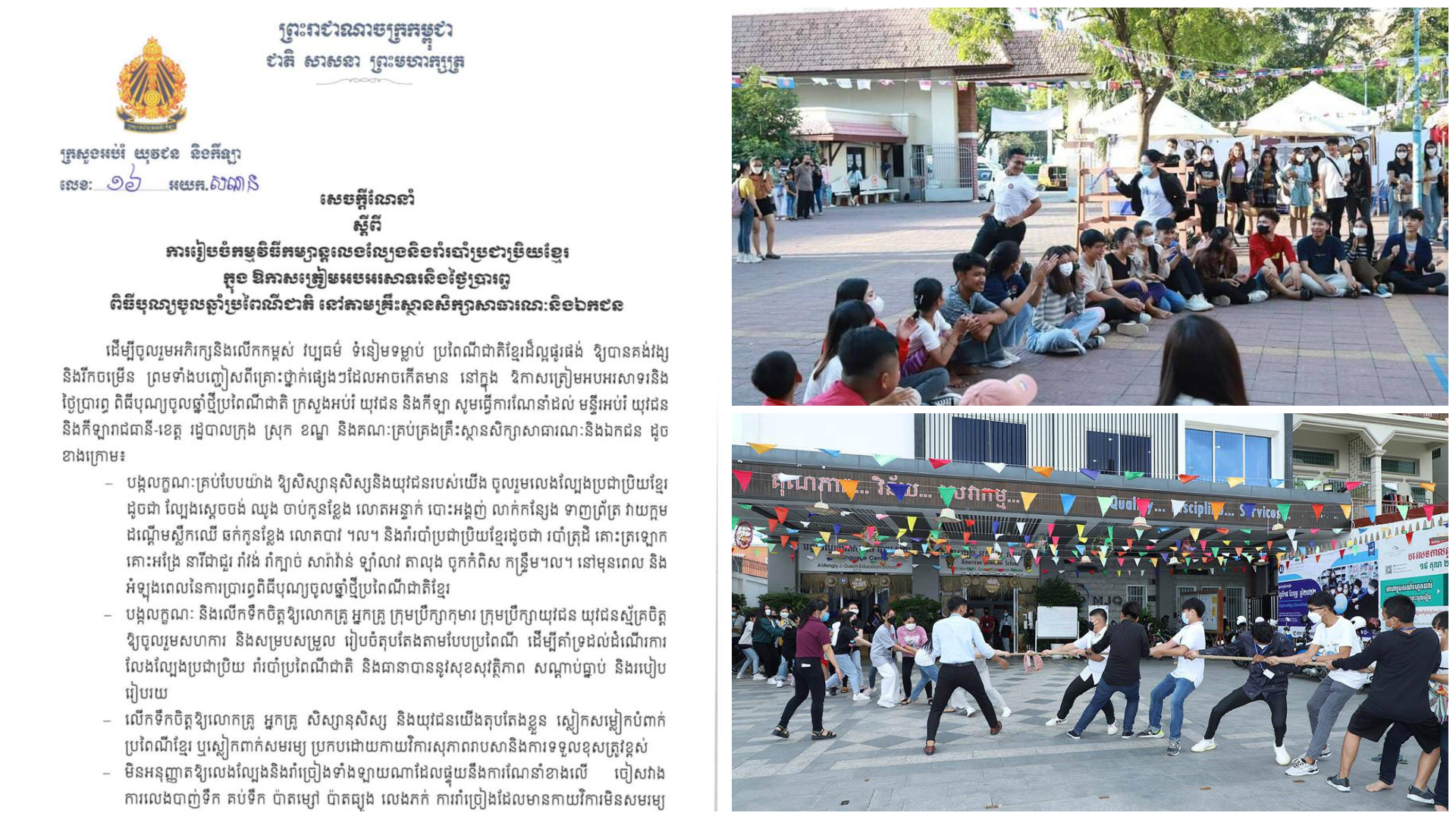 ក្រសួងអប់រំ ណែនាំឱ្យគ្រប់គ្រងគ្រឹះស្ថានសិក្សា រៀបចំកម្មវិធីកម្សាន្តលេងល្បែង និងរាំរបាំប្រជាប្រិយខ្មែរ ក្នុងឱកាសត្រៀមអបអរសាទរ និងថ្ងៃប្រារព្ធពិធីបុណ្យចូលឆ្នាំ