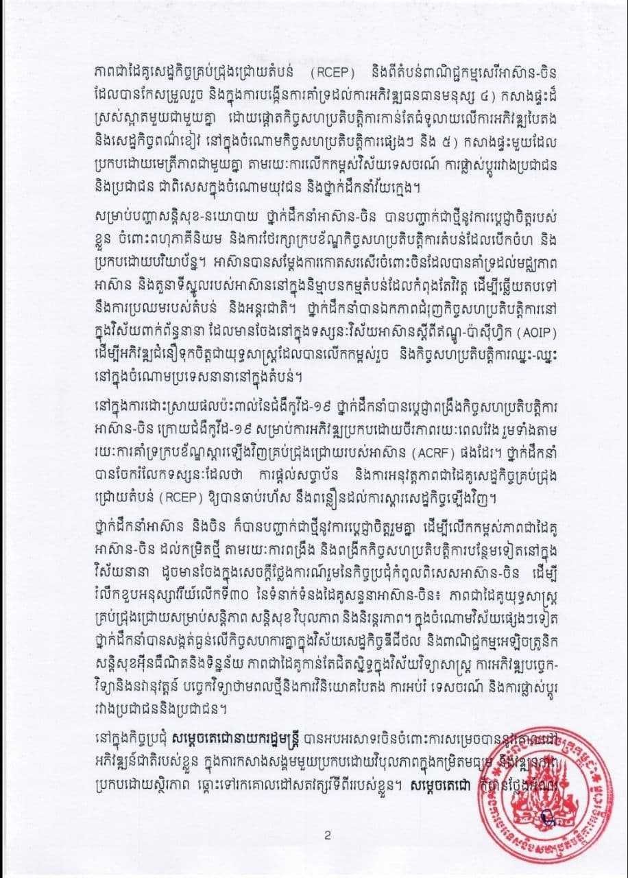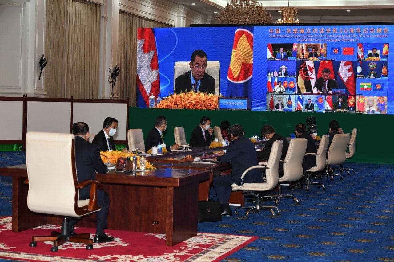 សម្តេចអគ្គមហាសេនាបតីតេជោ ហ៊ុន សែន នាយករដ្ឋមន្រ្តីនៃព្រះរាជាណាចក្រកម្ពុជា បានអញ្ជើញចូលរួមកិច្ចប្រជុំកំពូលពិសេសអាស៊ាន -ចិន ដើម្បីរំលឹកខួប អនុស្សាវរីយ៍លើកទី៣០ នៃទំនាក់ទំនងដៃគូសន្ទនាអាស៊ាន-ចិន តាមប្រព័ន្ធវីដេអូ តបតាមការអញ្ជើញ របស់ លោកស៊ី ជីនពីង ប្រធានាធិបតីនៃសាធារណរដ្ឋប្រជាមានិតចិន ដែលជាសហប្រធាននៃកិច្ចប្រជុំនេះ។