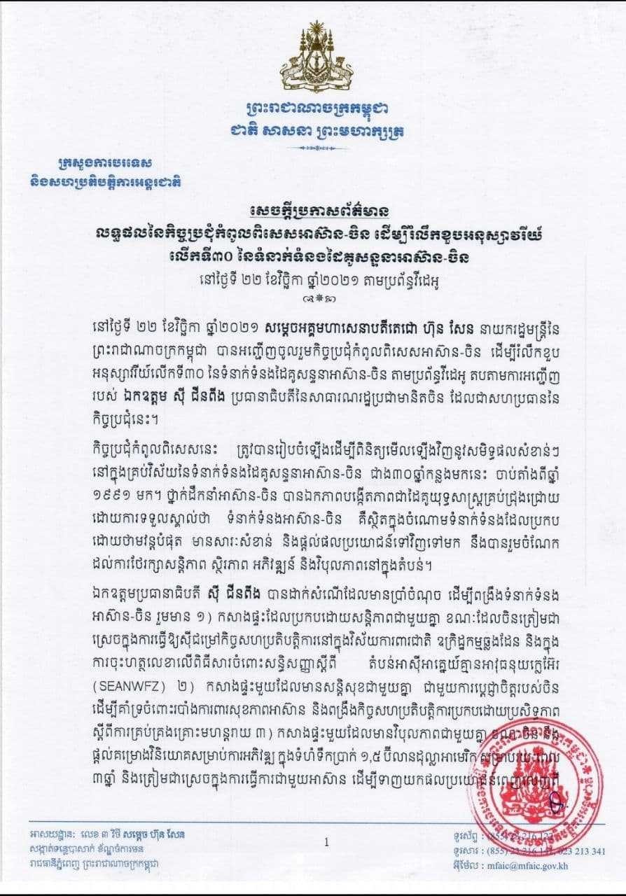 ភ្នំពេញ៖ លទ្ធផលនៃកិច្ចប្រជុំកំពូលពិសេសអាស៊ាន-ចិន ដើម្បី រំលឹកខួបអនុស្សាវរីយ៍លើក ទី៣០នៃទំនាក់ទំនងដៃគូសន្ទនាអាស៊ាន -ចិននៅថ្ងៃទី ២២ ខែវិច្ឆិកា ឆ្នាំ២០២១ តាមប្រព័ន្ធវីដេអូកាលពីព្រឹកថ្ងៃទី២២ ខែវិច្ឆិកា ឆ្នាំ២០២១ ។