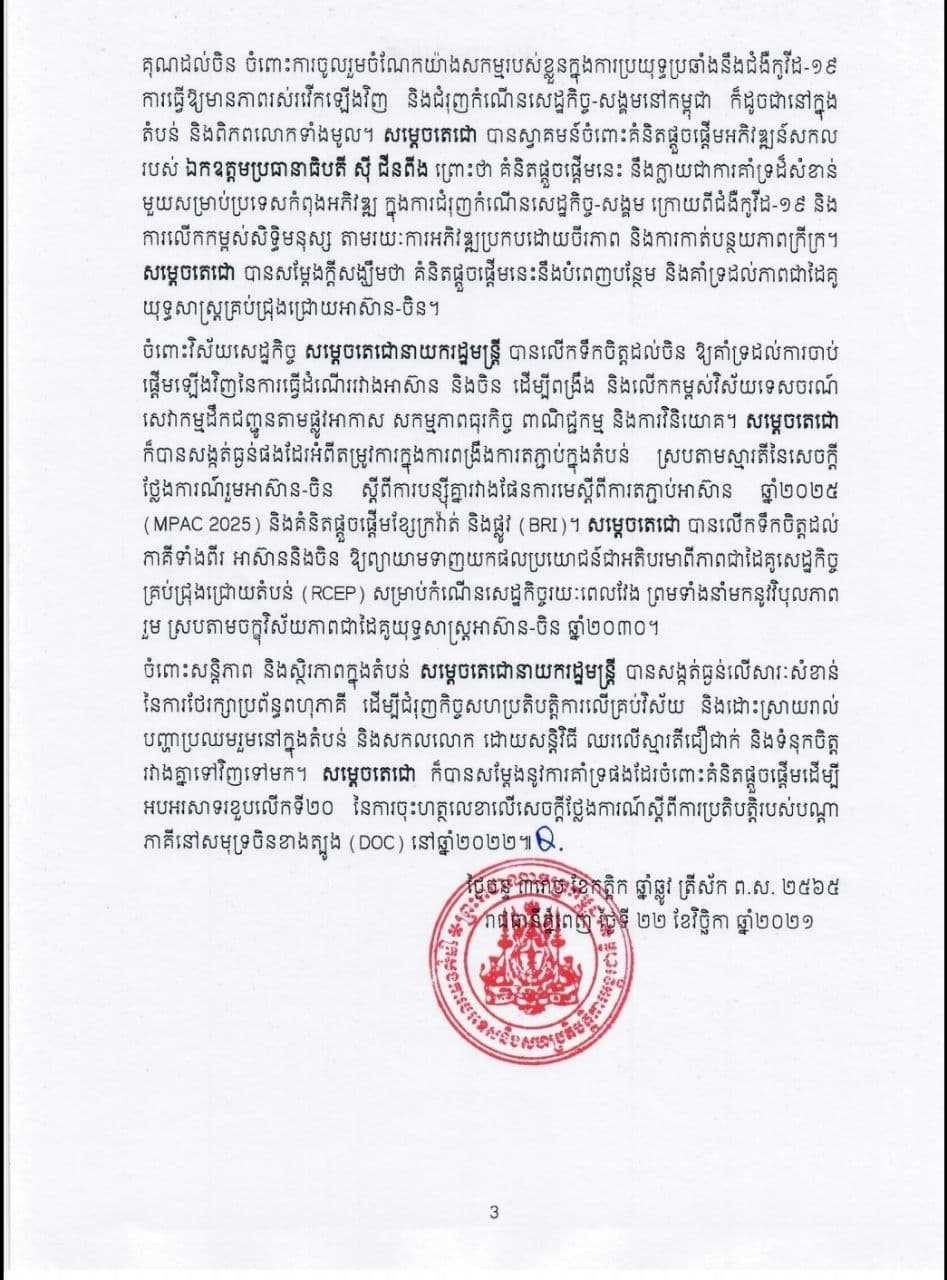 នៅក្នុងកិច្ចប្រជុំ សម្តេចតេជោនាយករដ្ឋមន្ត្រី បានអបអរសាទរចិនចំពោះការសម្រេចបាននូវគោល ដៅ អភិវឌ្ឍន៍ជាតិរបស់ខ្លួន ក្នុងការកសាងសង្គមមួយប្រកបដោយវិបុលភាពក្នុងកម្រិតមធ្យម និងវឌ្ឍនភាព ប្រកបដោយស្ថិរភាព ឆ្ពោះទៅរកគោលដៅសតវត្សរ៍ទីពីររបស់ខ្លួន។ សម្តេចតេជោ ក៏បានថ្លែងអំណរគុណដល់ចិន ចំពោះការចូលរួមចំណែកយ៉ាងសកម្មរបស់ខ្លួនក្នុងការប្រយុទ្ធប្រឆាំង នឹងជំងឺកូវីដ-១៩ ការធ្វើឱ្យមានភាពរស់រវើកឡើងវិញ និងជំរុញកំណើនសេដ្ឋកិច្ច -សង្គមនៅកម្ពុជា ក៏ដូចជានៅក្នុងតំបន់ និងពិភពលោកទាំងមូល។