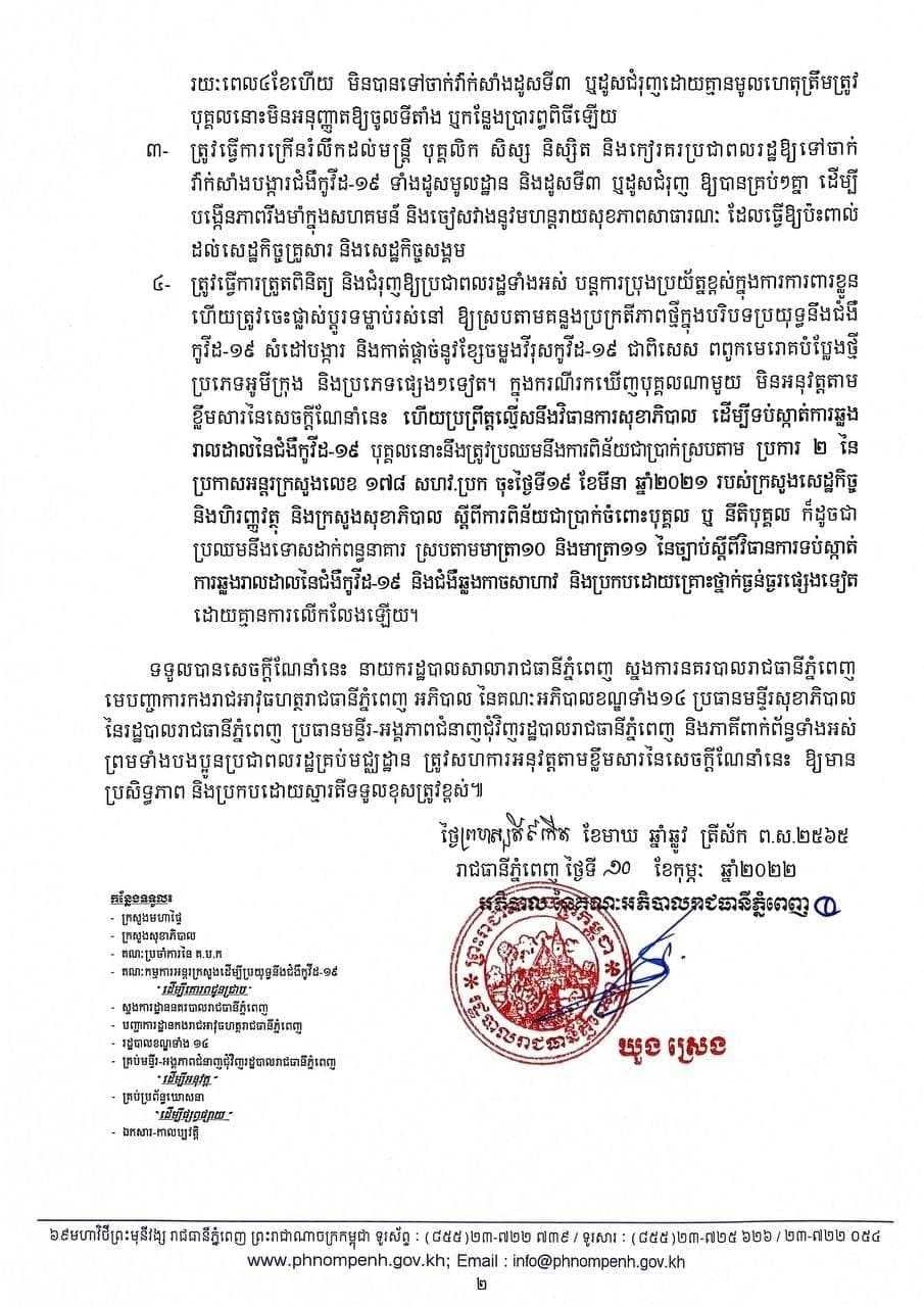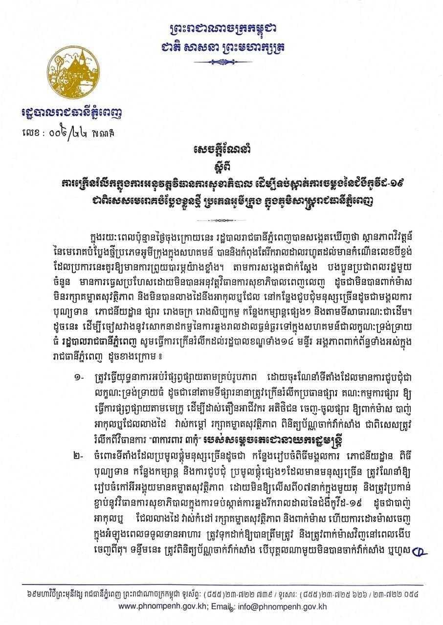 ក្នុងសេចក្ដីណែនាំរបស់រដ្ឋបាលរាជធានីភ្នំពេញ បានឱ្យដឹងថា ក្នុងរយៈពេលប៉ុន្មានថ្ងៃចុងក្រោយនេះ រដ្ឋបាលរាជធានីភ្នំពេញបានសង្កេតឃើញថា ស្ថានភាពវិវត្តន៍នៃមេរោគបំប្លែងថ្មីប្រភេទអូមីក្រុងក្នុងសហគមន៍ បាននិងកំពុងតែរីករាលដាលរហូតដល់មានកំណើនលេងខបីខ្ទង់ ដែលប្រការនេះគួរឱ្យមានការព្រួយបារម្ភយ៉ាងខ្លាំង។ តាមការសង្កេតជាក់ស្តែង ប្រជាពលរដ្ឋមួយចំនួន មានការធ្វេសប្រហែសដោយមិនបានអនុវត្តវិធានការសុខាភិបាលពេញលេញ ដូចជាមិនបានពាក់ម៉ាស មិនរក្សាគម្លាតសុវត្ថិភាព និងមិនបានលាងដៃនឹងអាកុល ឬជែល នៅកន្លែងជួបជុំមនុស្សច្រើនដូចជាមង្គលការ បុណ្យទាន ភោជនីយដ្ឋាន ផ្សារ រោងចក្រ រោងសិប្បកម្ម កន្លែងកម្សាន្តផ្សេងៗ និងតាមទីសាធារណៈជាដើម។ ដូចនេះ ដើម្បីចៀសវាងនូវសោកនាដកម្មនៃការឆ្លងរាលដាលធ្ងន់ធ្ងរទៅក្នុងសហគមន៍ជាលក្ខណៈទ្រង់ទ្រាយធំ រដ្ឋបាលរាជធានីភ្នំពេញ ក្រើនរំលឹកដល់រដ្ឋបាលខណ្ឌទាំង១៤ មន្ទីរ អង្គភាពពាក់ព័ន្ធទាំងអស់ក្នុងរាជធានីភ្នំពេញ ត្រូវធ្វើយុទ្ធនាការអប់រំផ្សព្វផ្សាយតាមគ្រប់រូបភាព ដោយចុះណែនាំទីតាំងដែលមានការជួបជុំជាលក្ខណៈទ្រង់ទ្រាយធំ ដូចជានៅតាមទីផ្សារនានា ត្រូវក្រើនរំលឹកប្រធានផ្សារ គណៈកម្មការផ្សារ ឱ្យ ធ្វើការផ្សព្វផ្សាយតាមមេក្រូ ដើម្បីដាស់តឿនអាជីវករ អតិថិជន ចេញ-ចូលផ្សារ ឱ្យពាក់ម៉ាស បាញ់អាកុល ឬជែលលាងដៃ វាស់កម្ដៅ រក្សាគម្លាតសុវត្ថិភាព ពិនិត្យប័ណ្ណចាក់វាំកំសាំង ជាពិសេសត្រូវរំលឹកពីវិធានការការពារ ៣កុំ ៣ការពារ។