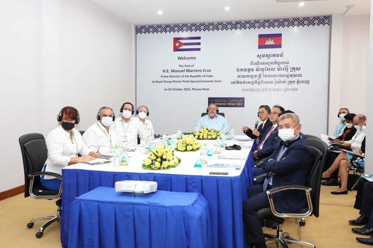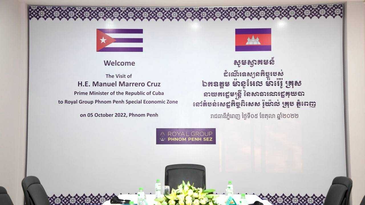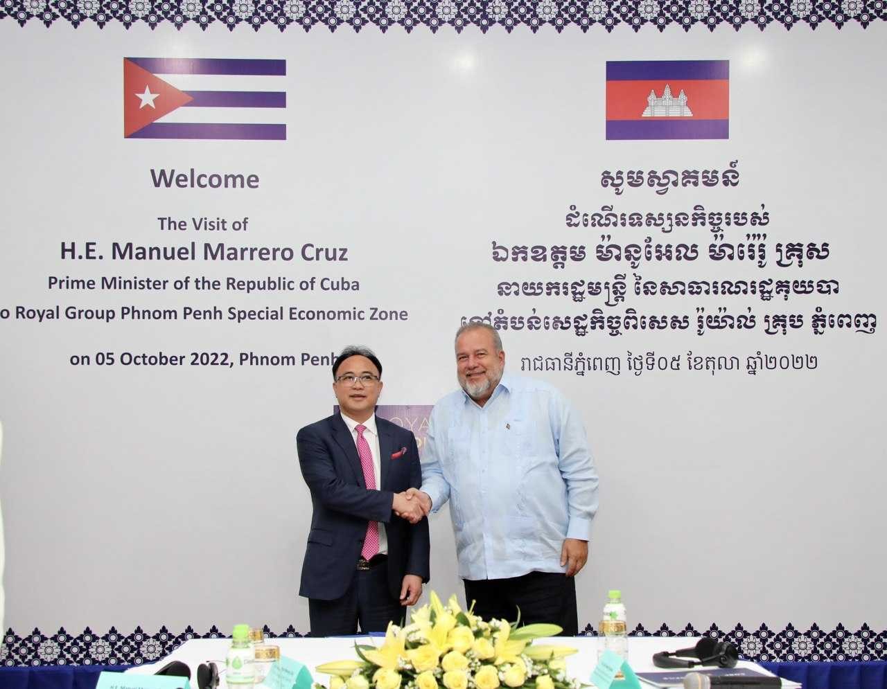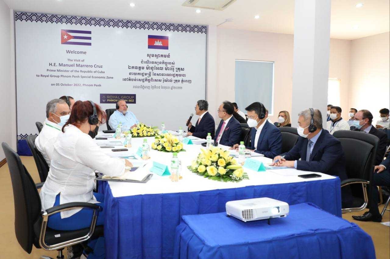 ភ្នំពេញ៖ នៅថ្ងៃទី០៥ ខែតុលា ឆ្នាំ២០២២ អ្នកឧកញ៉ា គិត ម៉េង អគ្គនាយកក្រុមហ៊ុន រ៉ូយ៉ាល់គ្រុប និងជាប្រធានក្រុមប្រឹក្សាភិបាលនៃក្រុមហ៊ុនភ្នំពេញ អេសអ៊ីហ្សិត ភីអិលស៊ី អញ្ជើញស្វាគមន៍លោក ម៉ានូអែល ម៉ារ៉េរ៉ូ គ្រុស នាយករដ្ឋមន្ត្រីនៃសាធារណរដ្ឋគុយបា ដែលធ្វើដំណើរទស្សនកិច្ចនៅតំបន់សេដ្ឋកិច្ចពិសេស រ៉ូយ៉ាល់ គ្រុប ភ្នំពេញ ដើម្បីសិក្សាស្វែងយល់ពីកាលានុវត្តភាពធុរកិច្ច និងស្វែងរកដៃគូសហការ៕