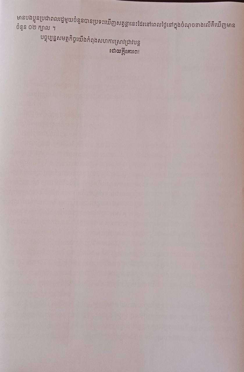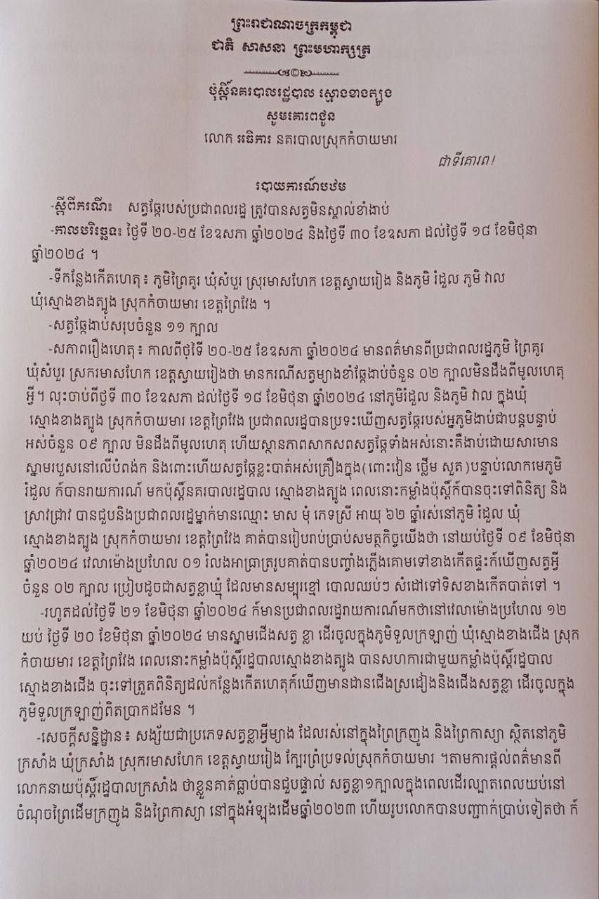 របាយការណ៍បានបន្តទៀតថា បន្ទាប់ពីបានទទួលព័ត៌មាននេះ លោកមេភូមិរំដួល ក៏បានរាយការណ៍ទៅប៉ុស្តិ៍នគរបាលរដ្ឋបាលស្ទោងខាងត្បូង ពេលនោះកម្លាំងប៉ុស្តិ៍ក៍បានចុះទៅពិនិត្យ និងស្រាវជ្រាវ បានជួបប្រជាពលរដ្ឋម្នាក់មានឈ្មោះ មាស មុំ ភេទស្រី អាយុ៦២ឆ្នាំ រស់នៅភូមិរំដួល ឃុំស្ទោងខាងត្បូង ស្រុកកំចាយមារ ខេត្តព្រៃវែង។ គាត់បានរៀបរាប់ប្រាប់សមត្ថកិច្ចថា នៅយប់ថ្ងៃទី៩ ខែមិថុនា ឆ្នាំ២០២៤ វេលាម៉ោងប្រហែល ១រំលងអាធ្រាត្រ គាត់បានបញ្ចាំងភ្លើងគោមទៅខាងកើតផ្ទះក៏ឃើញសត្វចំនួន ២ក្បាល ប្រៀបដូចជាសត្វខ្លាឃ្មុំ ដែលមានសម្បុរខ្មៅ បោលឈប់ៗ សំដៅទៅទិសខាងកើតបាត់ទៅ។