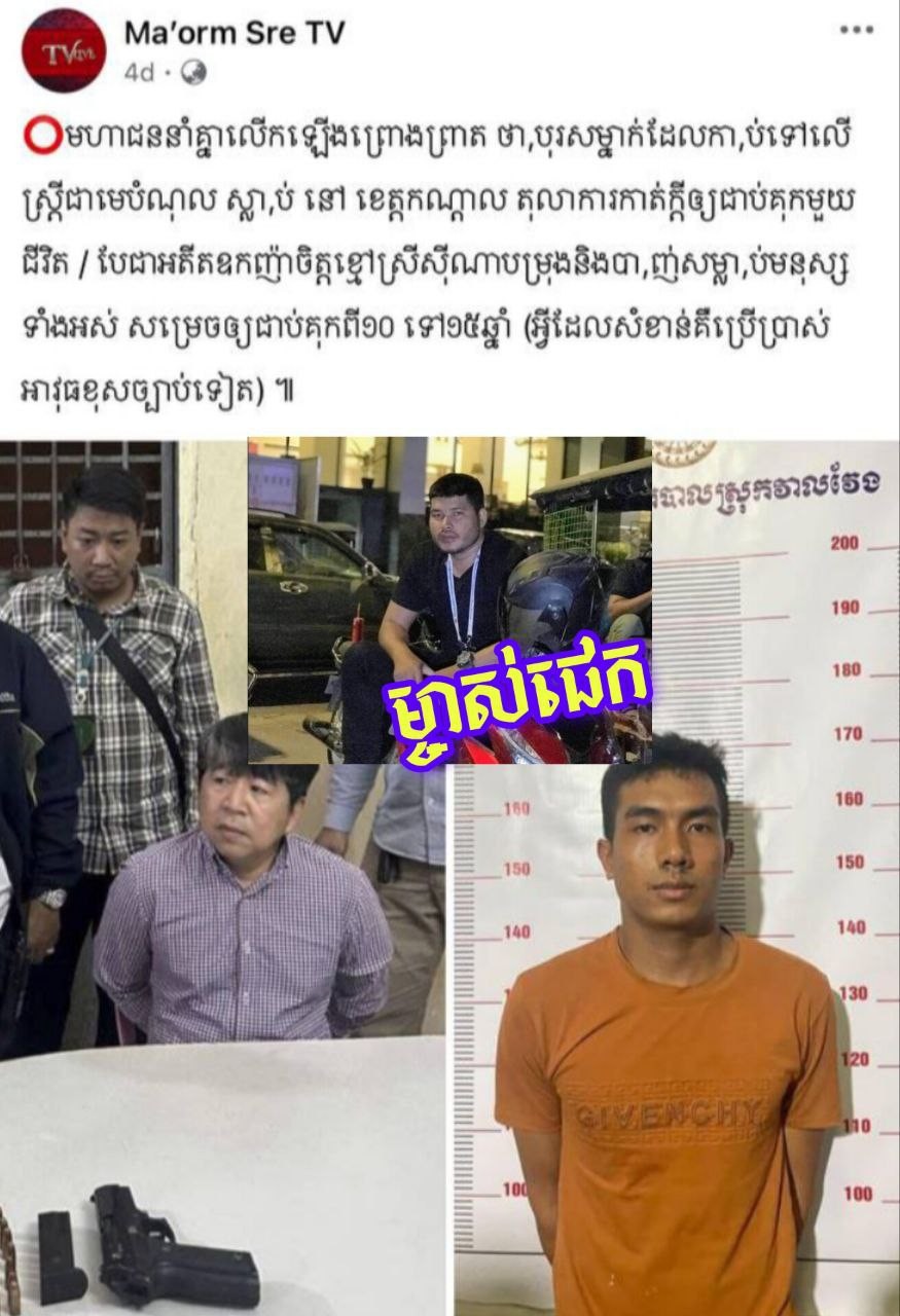 ភ្នំពេញ៖ អ្នកសារព័ត៌មានម្នាក់នៅស្ថាប័ន Ma'orm Sre TV ត្រូវបានកម្លាំងការិយាល័យព្រហ្មទណ្ឌ នៃស្នងការដ្ឋាននគរបាលខេត្តកណ្តាល សហការជាមួយនគរបាលរាជធានីភ្នំពេញ ឃាត់ខ្លួន ក្រោយផ្សាយព័ត៌មានថា ជនដែលកាប់ម្ចាស់បំណុលនៅខេត្តកណ្តាល ត្រូវបានកាត់ទោសជាប់ពន្ធនាគារអស់មួយជីវិត រីឯអតីត ឧកញ៉ា ស្រី ស៊ីណា ដែលបាញ់សម្លាប់មនុស្ស២នាក់ បែរជាកាត់ទោសត្រឹម ពី១០ ទៅ ១៥ឆ្នាំ។