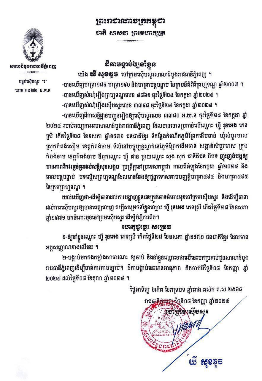 នៅរាត្រីថ្ងៃទី០៨ ខែកញ្ញា ឆ្នាំ២០២៤នេះ លោក យី សុខវួច ចៅក្រមស៊ើបសួរសាលាដំបូងរាជធានីភ្នំពេញ បានចេញដីកាបង្គាប់ឱ្យនាំខ្លួនឈ្មោះ «ហ៊ូ រុនអេង» ភេទស្រីទៅកាន់សាលាដំបូងរាជាធានីភ្នំពេញ ដើម្បីចាត់ការតាមផ្លូវច្បាប់។